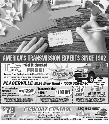 If you would like your delivery temporarily put on hold, call our of ce at least one week prior to the rst day to be stopped. You can also visit our website at mtdemocrat.com, scroll to the bottom and select “Customer Service.” MISSED DELIVERY Call 530-344-5000. If you have not received your paper leave us a message, we’ll return your call. SUBSCRIPTION RATES Call (530) 344-5000 to subscribe 3 mos. 6