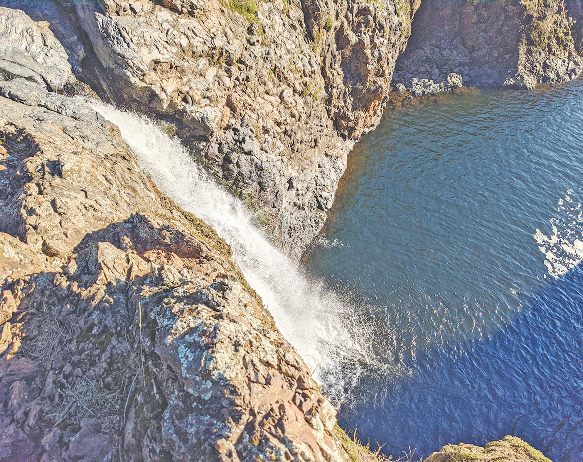 This 5-mile loop trail takes you through old pastureland, offering sweeping views through the oakdotted fields. The property is wellmaintained, making for an enjoyable, easy hike that leads to the threetiered waterfalls. The upper falls are fenced off due to a steep drop, while the middle section is accessible with some rock hopping and bouldering. The lower section is easier to reach and offers a refreshing swimming hole if you visit during the summer months. Personally, I prefer the hike in winter or early spring when the fields are vibrant and green.
