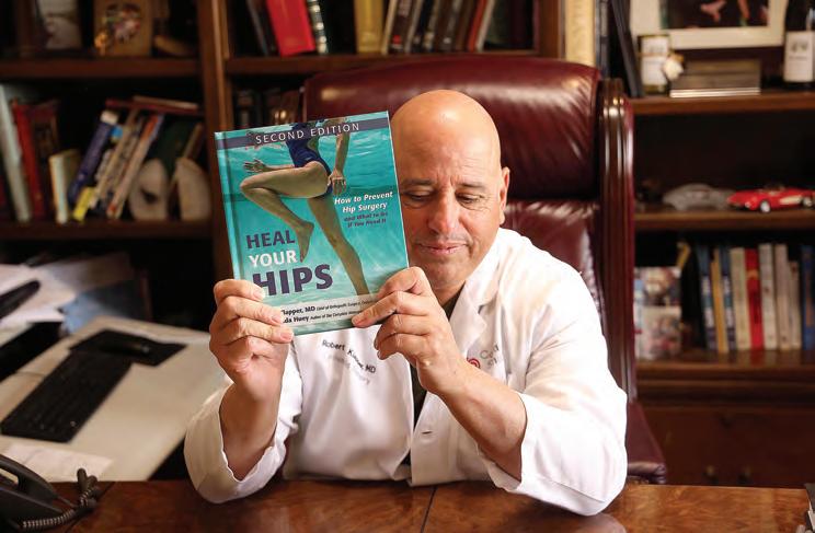 Dr. Robert Klapper holds up his book, “Heal Your Hips: How to Prevent Hip Surgery – and What to Do If You Need It,” in his office in West Hollywood.