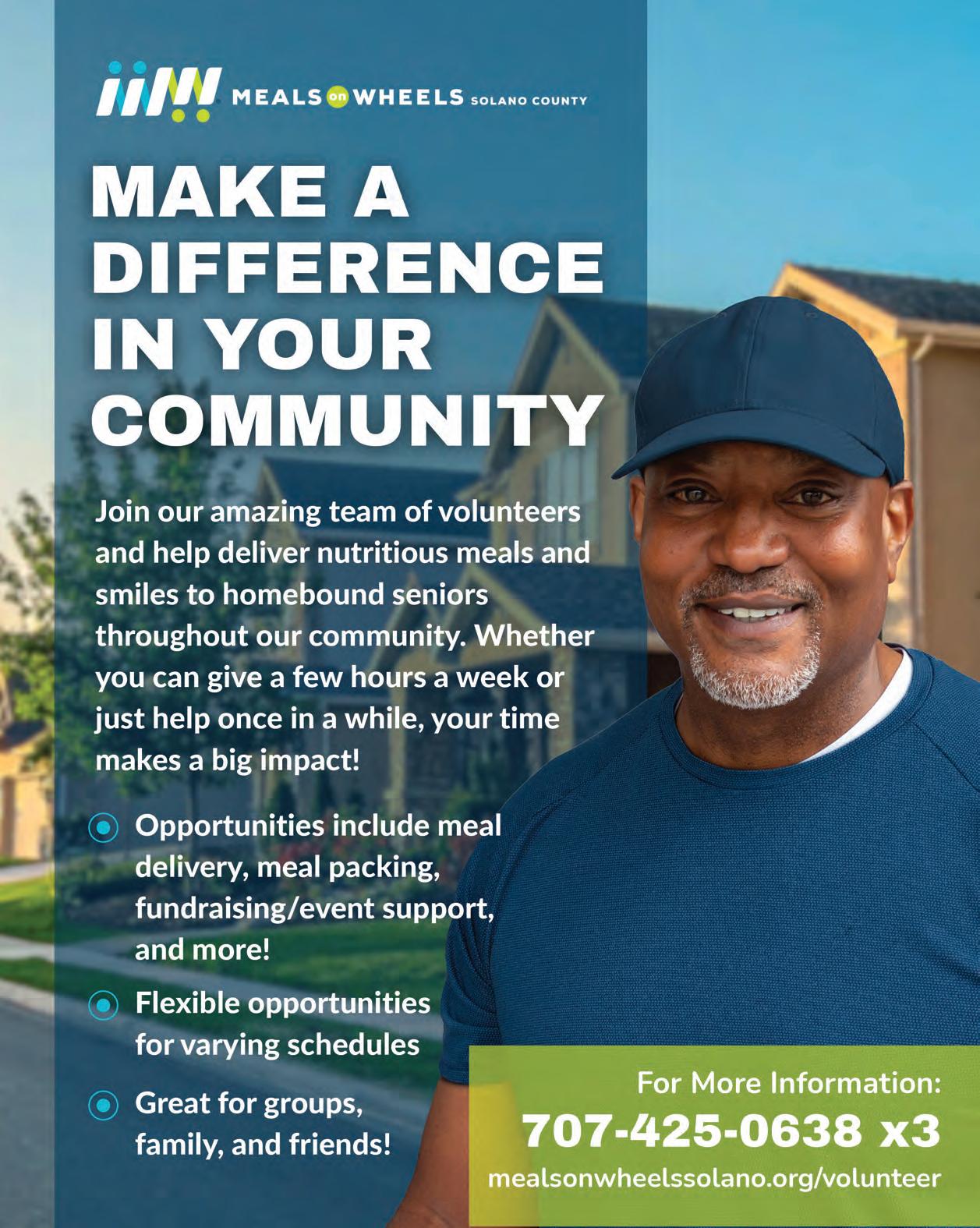 Ready to step in? Apply today and join a community of caring volunteers who show up – sometimes with a meal, always with heart. Your dedication can change lives and uplift the spirits of those who need it most. Visit mealsonwheelssolano.org/ volunteer to learn more and sign up. ❙