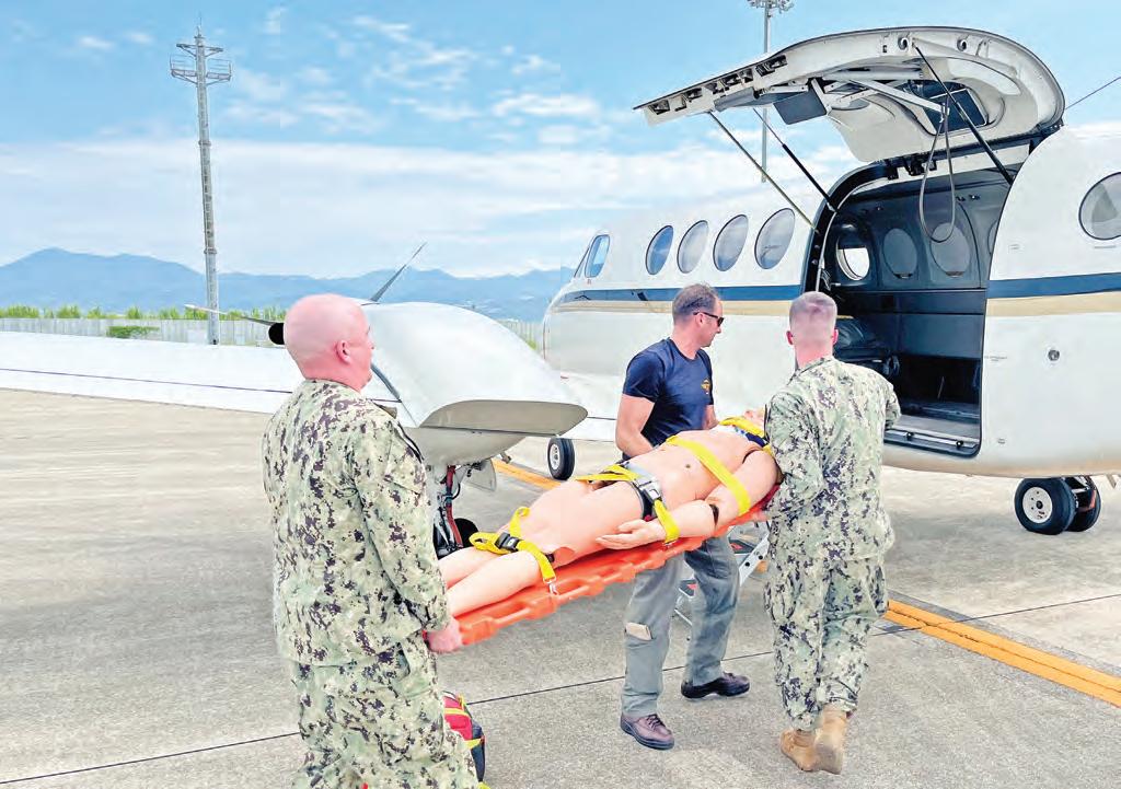 In the culminating scenario, medical personnel from Navy Medicine Readiness and Training Unit Sasebo transferred a simulated casualty to Nagasaki Airport, where it was met by a C-12 Huron aircraft assigned to NAF Atsugi and a medical crew from NMRTC Yokosuka. The aircraft flew to Atsugi, where the patient was offloaded and transported by ambulance to Naval Hospital Yokosuka for further treatment.