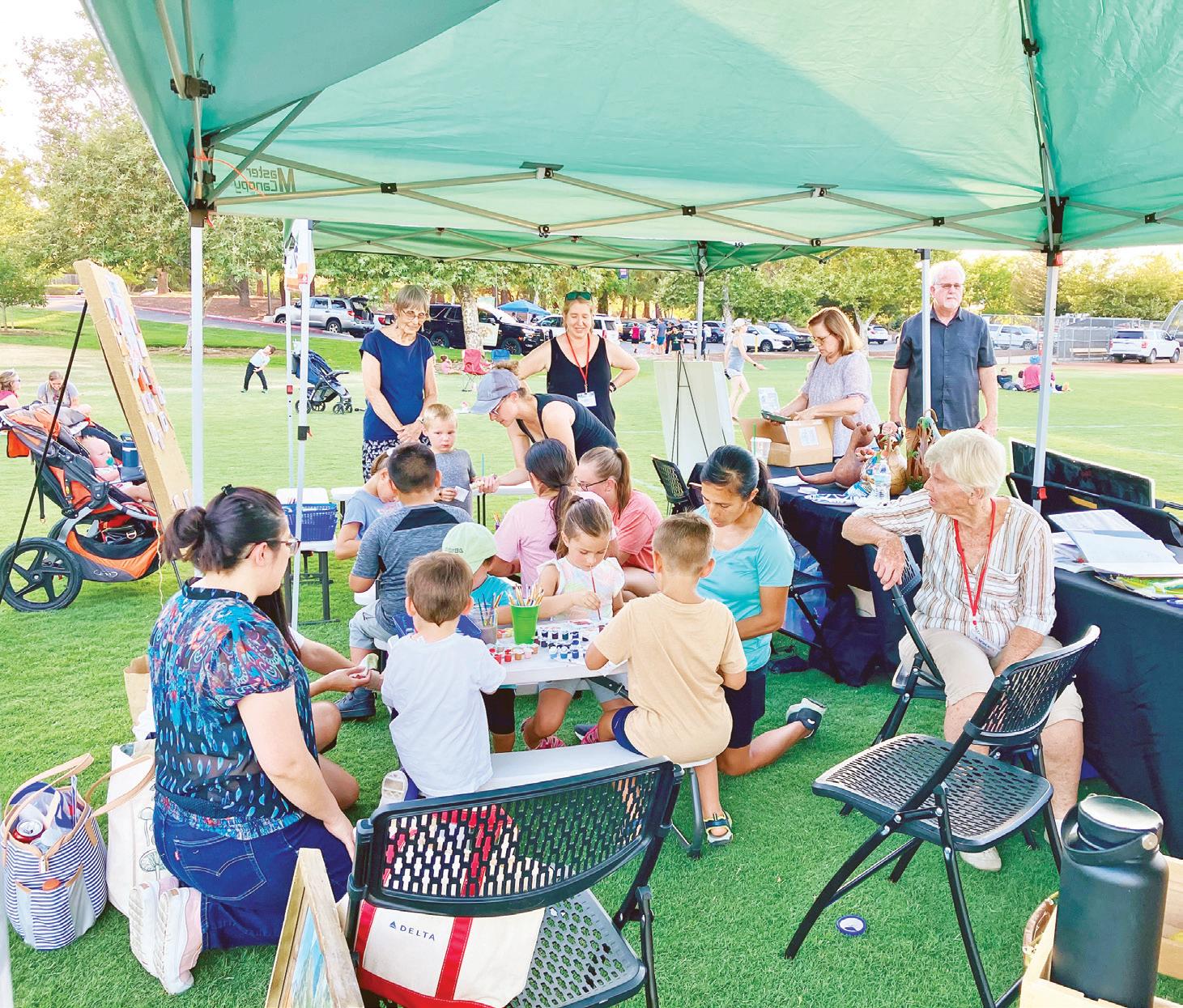 El Dorado Hills residents gathered at Community Park Friday, Aug. 8, for an evening of camaraderie, food, games, demonstrations and more during the National Night Out celebration hosted by the El Dorado Hills Community Services District. Residents met and chatted with rst responders, nonpro t volunteers and other community group representatives at the booths set up around the park. They also had the opportunity to check out equipment used by the El Dorado County Sheri ’s O ce and El Dorado Hills Fire Department. Above, EDH residents watch as EDSO’s Echo 1 comes in for a landing at Community Park. At right, kids enjoy making art at the El Dorado Hills Arts Association tent set up for NNO.
