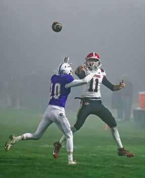 Winters quarterback Lane Brown releases a pass as a Minarets defender closes in during Saturday’s fog-shrouded NorCal Regional Championship game.