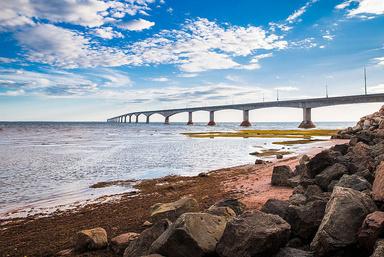The Confederation Bridge is a 13-km engineering phenomenon Connecting from New Brunswick, the Bridge is open 24 hours a day and takes approximately 12 minutes to cross. Tolls are collected when leaving PEI.