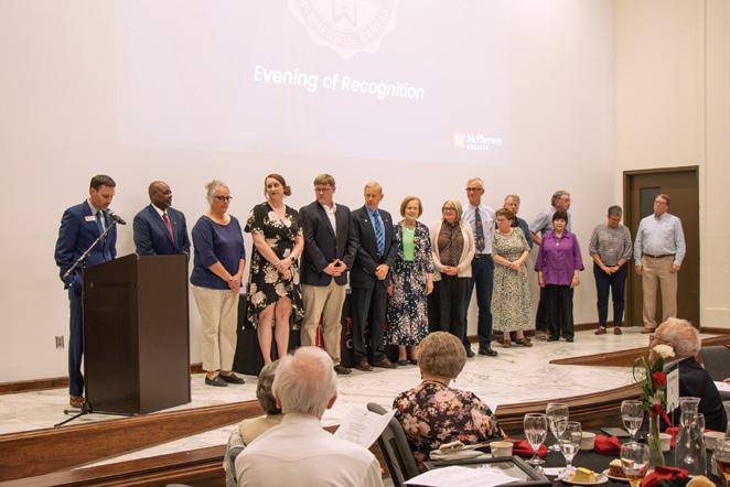 The McPherson College community gathered to celebrate 20 employees and trustees for their years of service with a reception, dinner, and awards program at the McPherson Community Building in March. The annual recognition night celebrated the work of faculty, staff, and board of trustee members who have served the college for five to 25 years. Those recognized include: