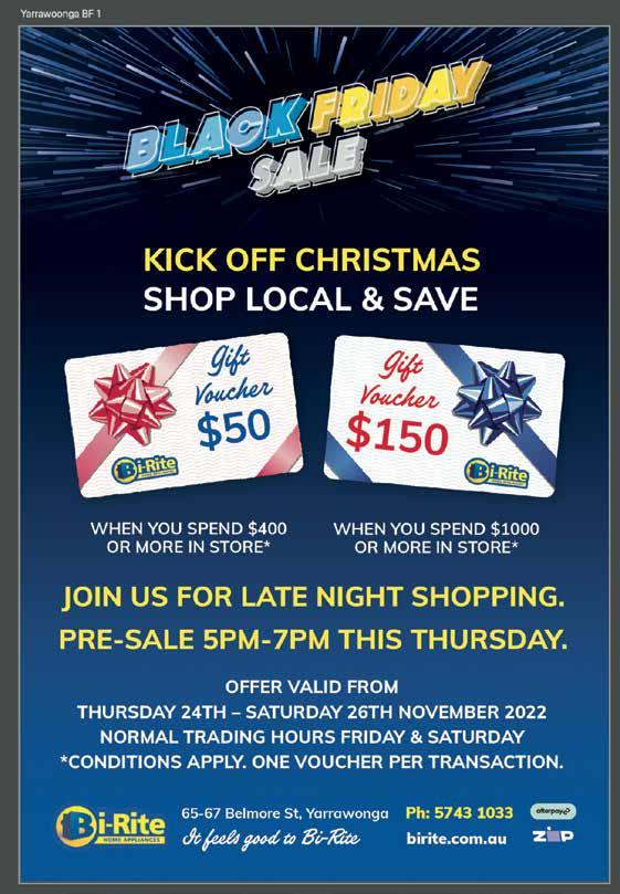 97-99 Belmore Street, Yarrawonga Ph 03 5744 1269 97-99 Belmore Street, Yarrawonga Ph 03 5744 1269 E: juddsyarra@netspace.net.au 97-99 Belmore Street, Yarrawonga Ph 03 5744 1269 97-99 Belmore Street, Yarrawonga Ph 03 5744 1269 E: juddsyarra@netspace.net.au WORKWEAR UNIFORMS AND EMBROIDERY WORKWEAR UNIFORMS AND EMBRO DERY 97-99 Belmore St, Yarrawonga 03 5744 1269 CONDITIONS APPLY THURSDAY 24th NOV: 5pm - 8pm FRIDAY 25th NOV: 8.45am - 5.30pm SATURDAY 26th NOV: 9am - 2pm SUNDAY 27th NOV: 10am - 2pm FREE GIFT Spend $99 or more in one transaction & receive a FREE Quicksilver or Roxy towel valued at $49.95 Limit 1 per person until sold out. STOREWIDE 1 BIG NIGHT & 3 DAYS ONLY SHOPPING EVENT 20% OFF STARTS THURSDAY 24TH NOV 5PM-8PM Excludes Workwear, Schoolwear, Uniforms, Printing, Embroidery & already reduced items. Black Friday deals 9 Belmore St,Yarrawonga PH 0412 158 508 Patchwork Fabrics $15 (min.cut 50cm) mt Widebacks Knitting Yarns REDUCED Further Discounts Instore $10 OFF 33 BELMORE ST, YARRAWONGA 03 5744 1149 www.thebridgeofhealthfoods.com *Some exclusions and conditions apply. 15%OFFSTORE WIDE BLACK FRIDAY * 20-40% off Storewide • 40% off Tontine • 40% off Kids Range • 30% off Quilt Covers, Sheets and Towels • 20-30% off Homewares and Décor • Super Sale Table Open Thurs till 8pm, Black Friday & Saturday. 23A Belmore St, Yarrawonga • 0491 365 695 Blooms OF YARRAWONGA 69 Belmore Street, Yarrawonga5744 0042 FROM OFF50% Black Friday CLEARANCE *Excludes Flowers, Plants & Ecoya This Thursday, Friday, Saturday & Sunday only. ALL GIFT & HOMEWARES REDUCED TO CLEAR! Black Friday KEEPING IT LOCAL
