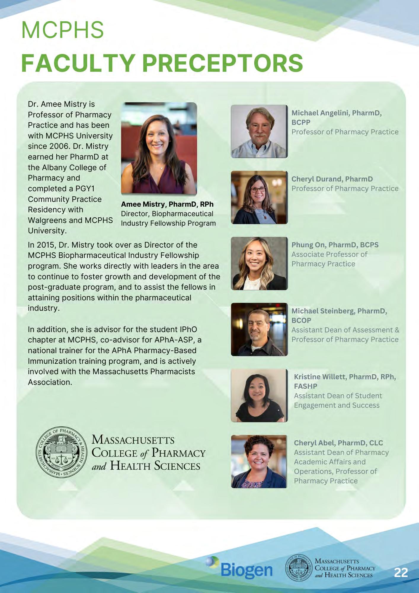 Biogen, in collaboration with MCPHS, offers eight unique fellowship programs to promote the role of the Doctor of Pharmacy (PharmD) within the biopharmaceutical industry: