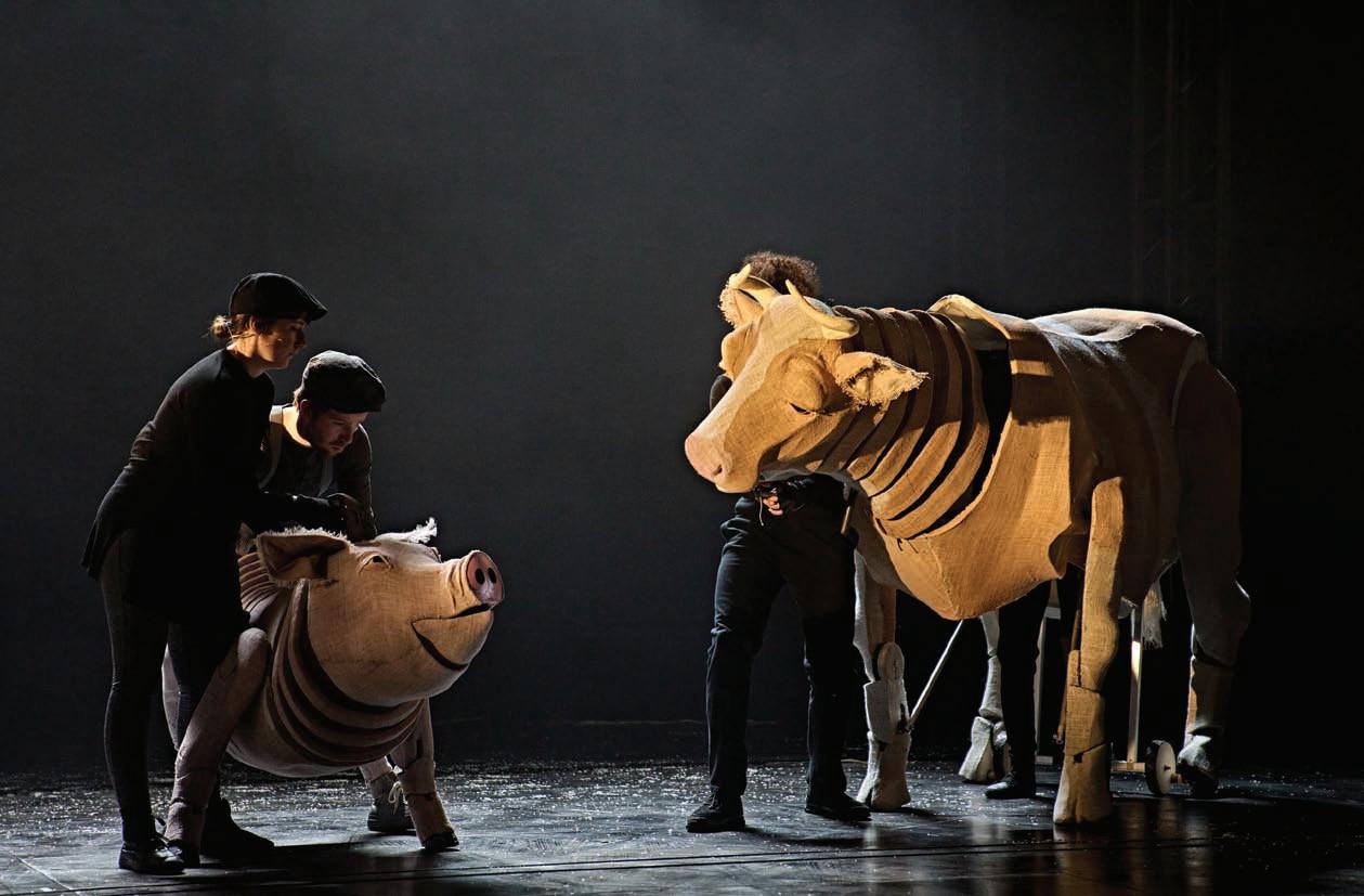 The relative sizes of the animals are mostly correct, although the smaller animals such as pigeons and chickens have slightly largerthan-life puppet representations. Toby explains that this is because it’s more effective for the proportion of puppet to puppeteer to favour the puppet. “Boxer the carthorse feels larger than life, but terrifyingly he is pretty much the size of a Drysdale Carthorse. They are just that big. He is absolutely enormous, controlled by three people. And then we’ve got a full-size dairy cow, all the way down to a one-person pigeon, so it’s a real sliding scale of animals.”