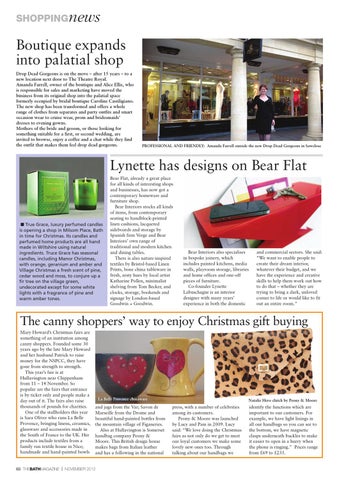 ■ True Grace, luxury perfumed candles is opening a shop in Milsom Place, Bath in time for Christmas. Its candles and perfumed home products are all hand made in Wiltshire using natural ingredients. Truce Grace has seasonal candles, including Manor Christmas, with orange, geranium and amber and Village Christmas a fresh scent of pine, cedar wood and moss, to conjure up a fir tree on the village green, undecorated except for some white lights with a fragrance of pine and warm amber tones.