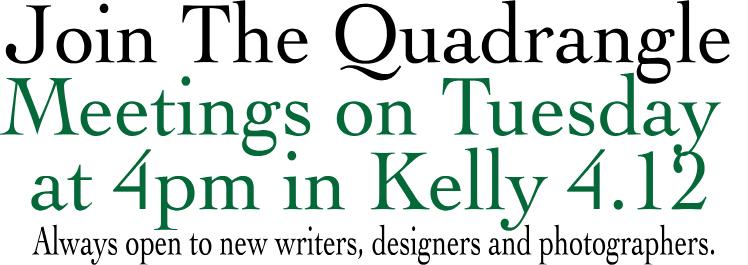 The Quadrangle’s staff holds weekly open meetings on Tuesdays at 4 p.m. in Kelly Commons Room 4.12. All are welcome to come and join the club.