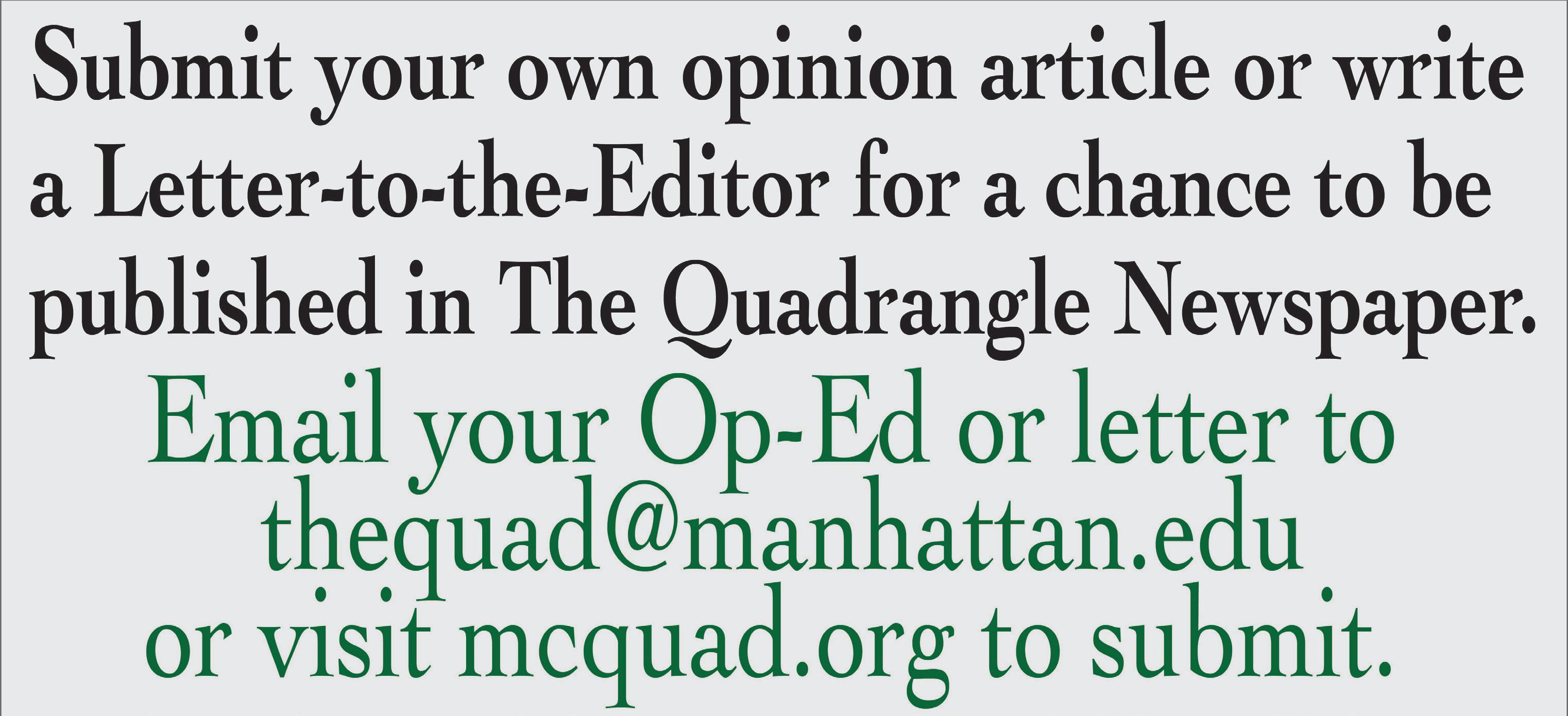 One of the reasons I am so excited about this issue is because we once again (for the first time since 2022!) are publishing an opinion piece from one of our writers! Opinion Editorials are a way for our writers, as well as members of the community, to comment on the issues most important to them. This provides me the perfect opportunity to remind you all that we can, and do, publish OpEds and Letters-to-theEditor from members of our community! If you find yourself with something you think needs to be published in our paper, always feel free to submit to thequad@manhattan.edu.