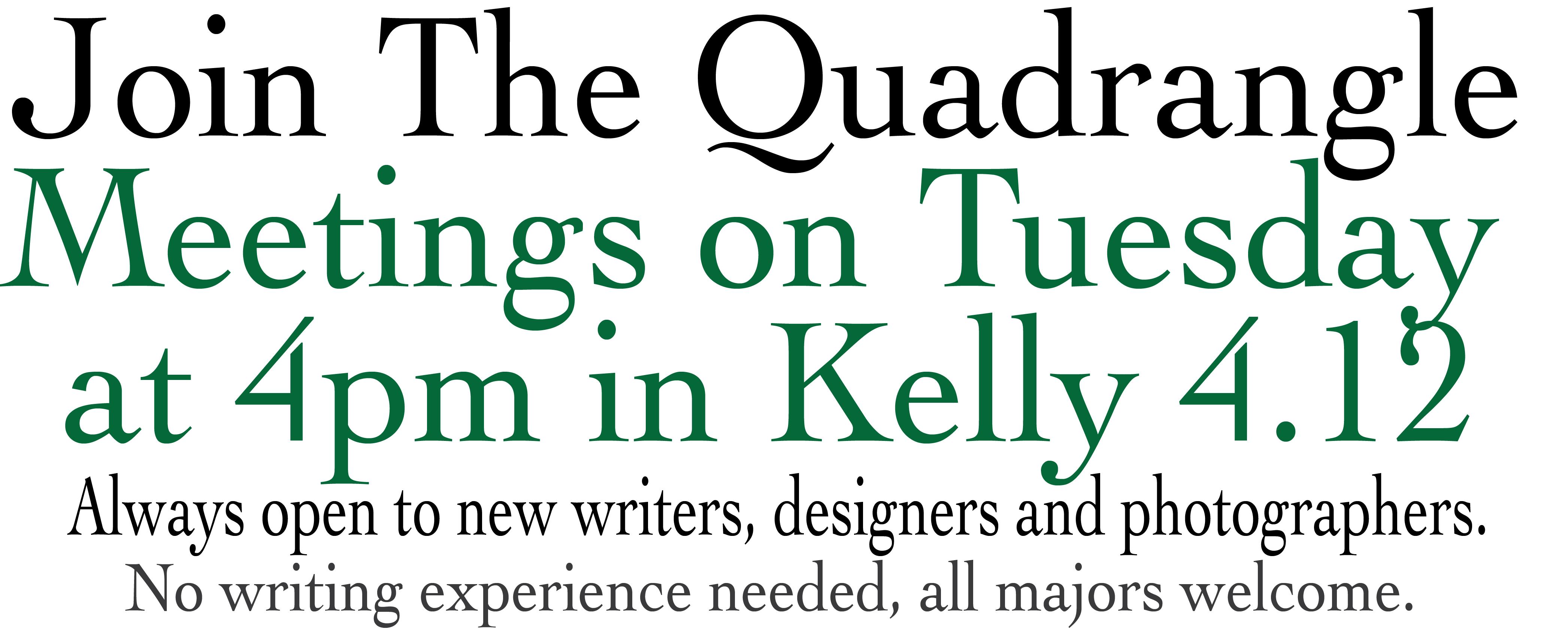 The Quadrangle’s staff holds weekly open meetings on Tuesdays at 4 p.m. in Kelly Commons Room 4.12. All are welcome to come and join the club.