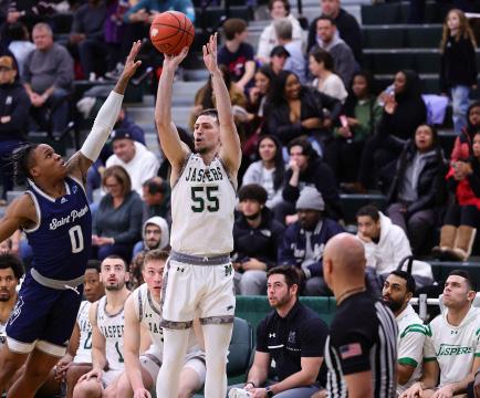 The team started off slowly with Saint Peters scoring the first basket of the night and taking the lead ahead of the Jaspers. The Jaspers quickly switched their attention to defense, with Josh Roberts stealing the first defensive rebound for the Jaspers.