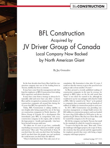 cumulation. My frustration is that after 45 years, I could see that the runway to get to the next level was going to take at least another 10 years.” As Brav perused a recently published ranking of construction companies in the state by revenue, he pointed to BFL’s place on the list and noted that “here” is not where he wanted to be, although he would never say he was unhappy with what he’s built at BFL. Still, he wanted to be “there” as he pointed to companies that consistently rack up hundreds of millions of dollars in construction projects each year. In 2017, BFL Construction was providing construction management or design/build services for $82 million in construction projects and was headed for more than $100 million in 2018 prior to the acquisition by JV Driver. But that was where Brav said he wanted his company to be 20 years ago. He felt his company was big for Tucson, but small by the standards by which he wanted to measure it. “I want to be big for the state,” Brav said. “I love the challenge with bigger projects, the scope of them, the creativity that they permit and the opportunities for employee growth that come with being a larger company with larger projects.” continued on page 137 >>> Summer 2018