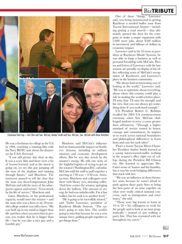 He was a freshman in college at the UA in 1984, watching a training film with his Navy ROTC unit about the disaster on the U.S.S. Forrestal. “I can still picture this clear as day. It was a scary film and there were a lot of lessons learned, and as the movie is going on, we see this guy jumping off the nose of the airplane and running through flames,” said Hutchens. The instructor paused to tell the class that the man was then-Congressman John McCain and told the story of his subsequent capture and torture. “I was struck by his life of service,” Hutchens said. Later, Hutchens, in his professional capacity, would meet the senator – and the man who was a hero to an 18-yearold college student was still a hero. “He was built up in my mind as bigger than life and then when you meet him in person, you realize that he is bigger than life – but he was also a nice guy and a humble guy.” www.BizTucson.com