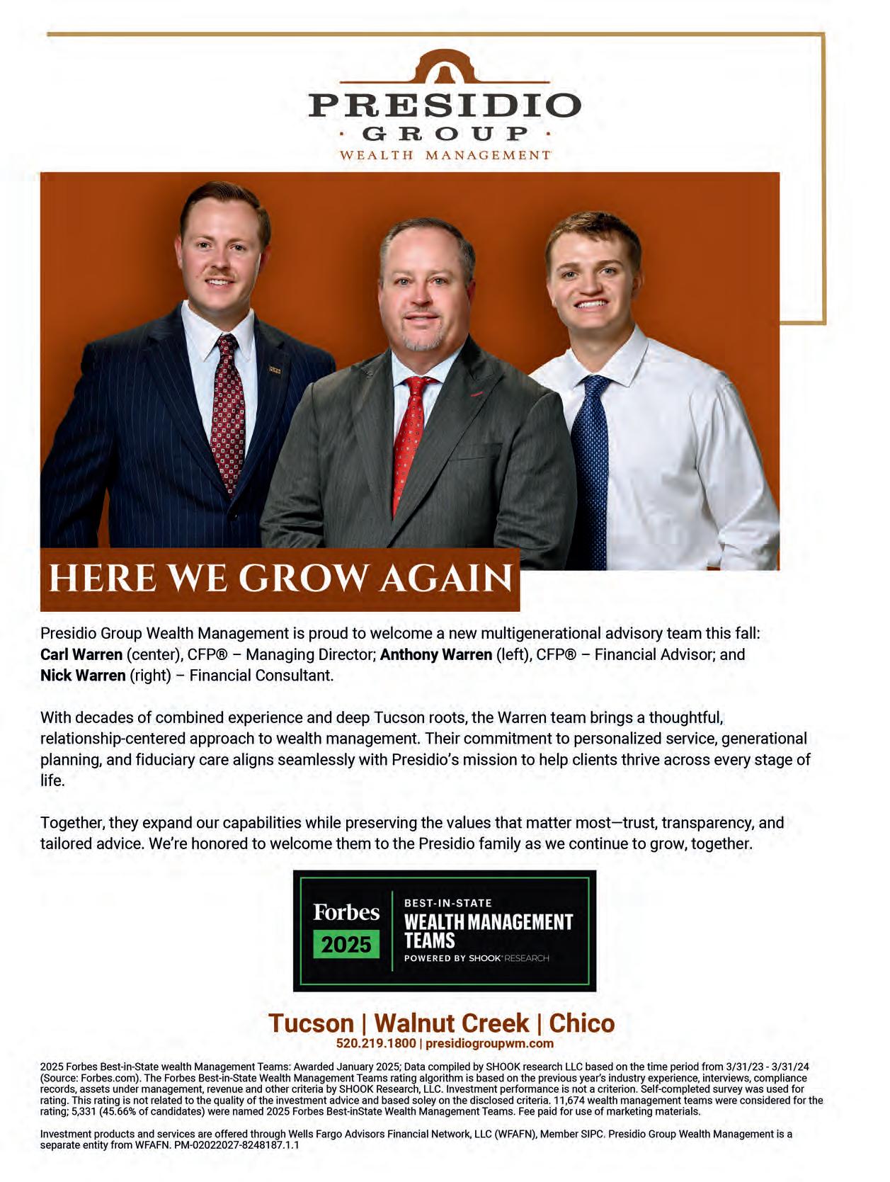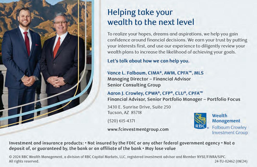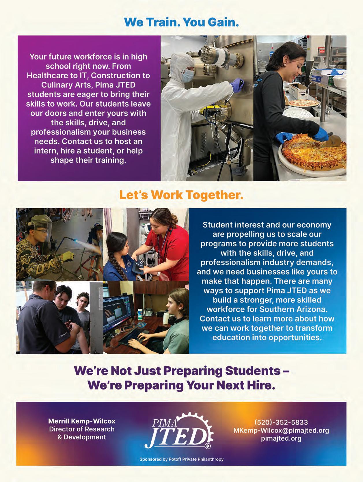 BizTucson Magazine Issue 4 (ISSN 1947-5047 print, ISSN 2833-6739 online) is published quarterly for $16 per year by Rosenberg Media, LLC., 4729 E. Sunrise Dr., PMB 505, Tucson, AZ 85718-4534. Periodicals postage pending at Phoenix, AZ, and additional mailing offices.