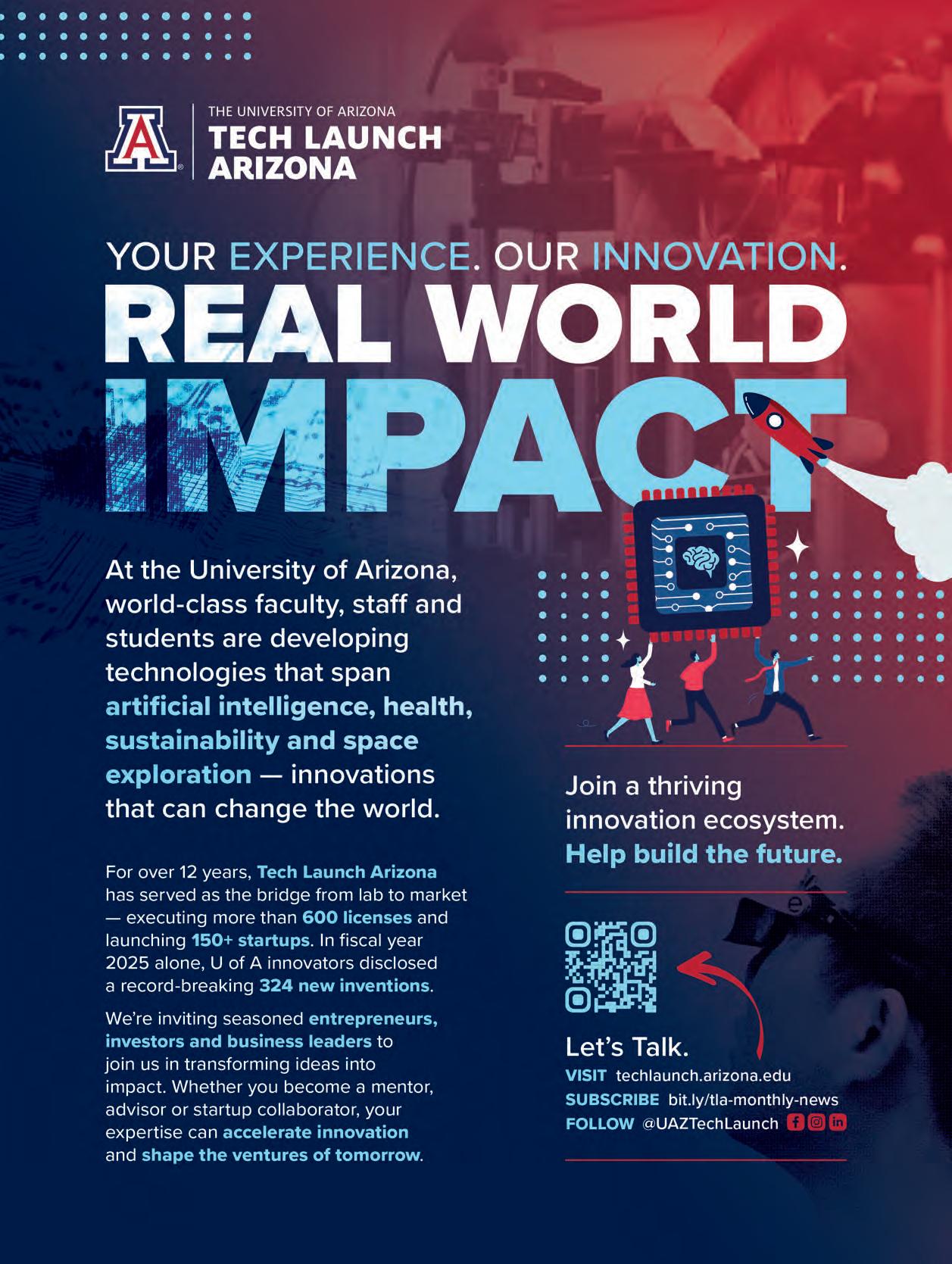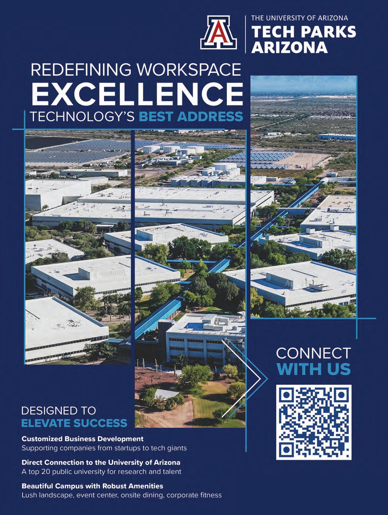 We include updates from the techdriven clusters of Biotech, Aerospace & Defense, Mining & Surface Technology and Optics & Photonics. Our team reports on UA innovations, PCC workforce development, Tech Launch Arizona, Tech Parks Arizona, our adaptive Entrepreneurial Ecosystem, successful tech ventures and promising startups.
