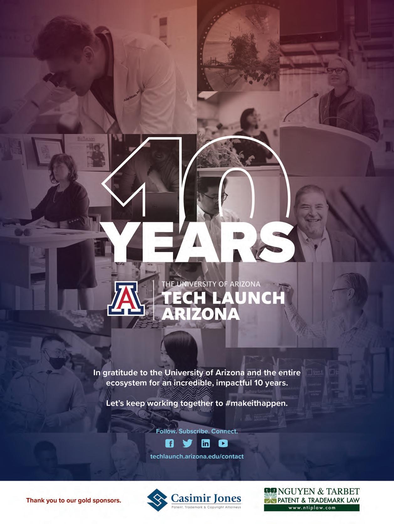 For 10 years, Tech Launch Arizona has paved the way for inventions de veloped at the University of Arizona to make their way into the commercial markets either by way of existing com panies who have licensed the technolo gies, or by way of startup companies founded to commercialize specific in ventions. TLA’s work has resulted in the formation of over 125 of those startups since 2012.