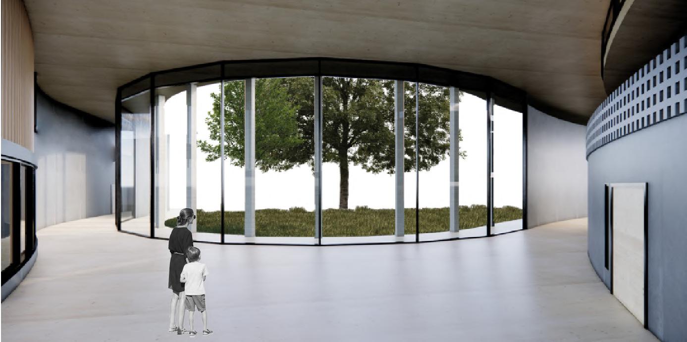 The interior and exterior rendering perspectives illustrate the dual aspects of this space. It features a substantial window that provides views of both the tree and the entire interior area, depending on one’s viewing angle.
