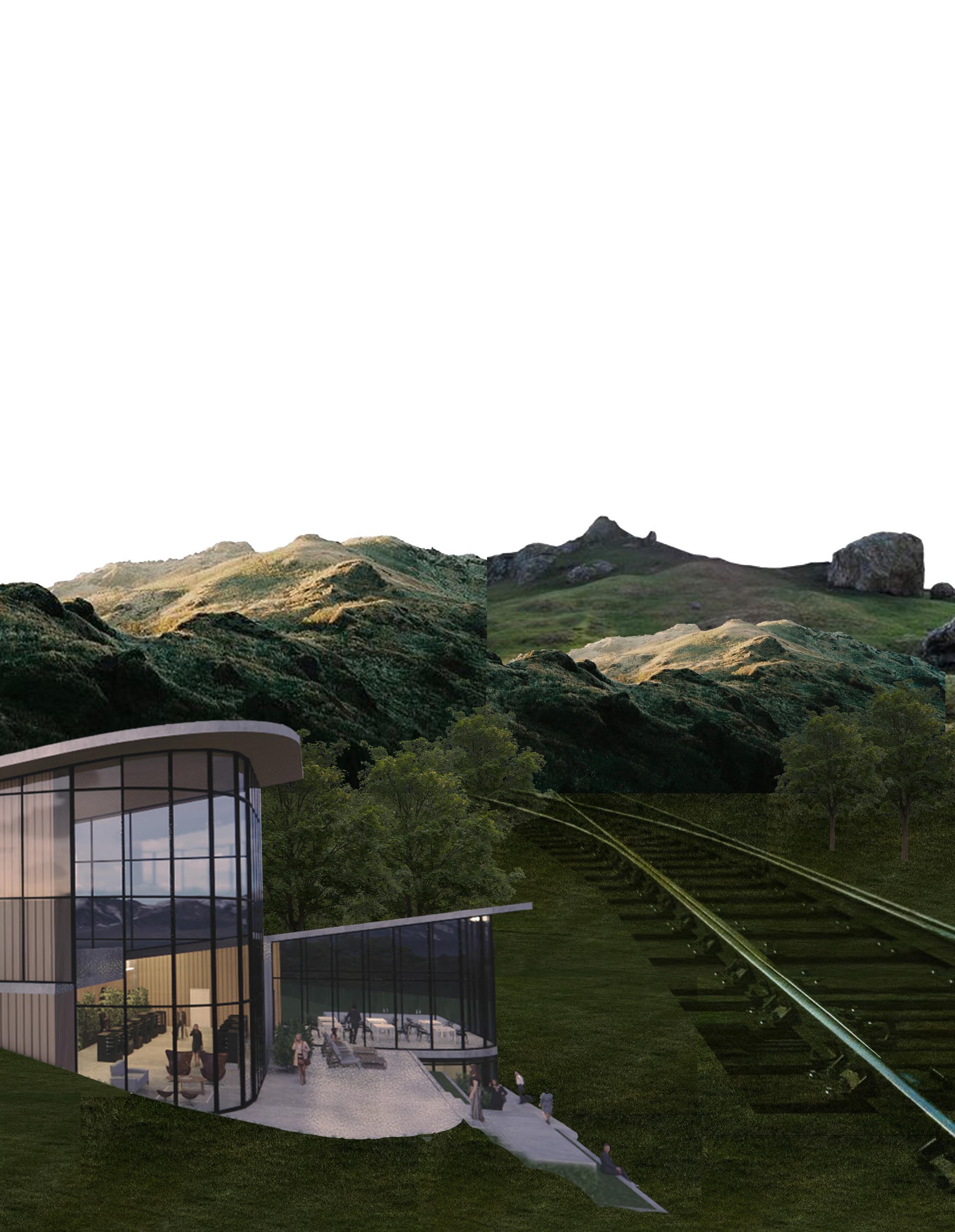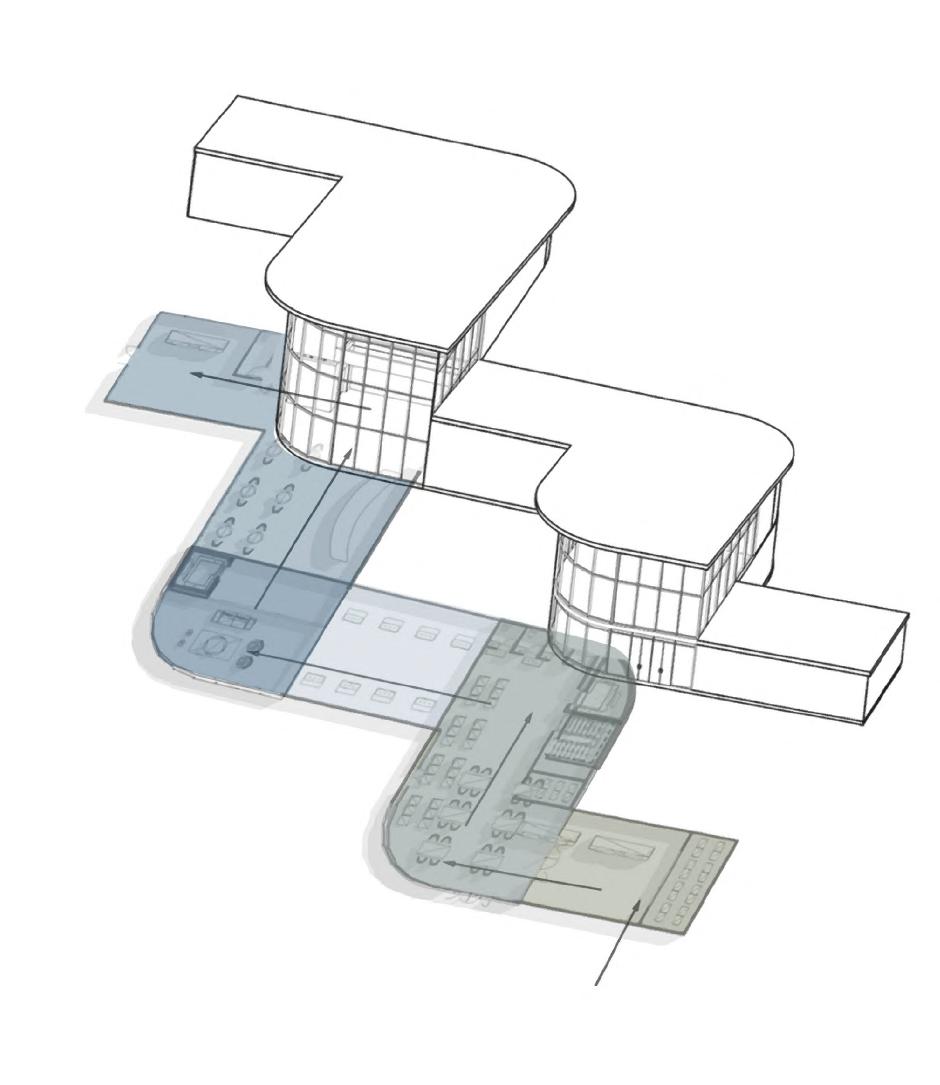 This area is divided into three sections: The first floor serves as the main entry point from the train station, offering essential amenities like information, ticketing, a waiting area, restrooms, and elevator access. The second floor is designed for relaxation and includes a lounge, retail space, seating area, and an outdoor section. The third floor features a cafe and an additional information and ticketing area for the convenience and enjoyment of visitors.