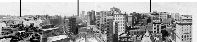 This view looking southwest across the Fairlie-Poplar District, shows many of the high-rises built in the 1910s and 1920s. An array of hotels punctuated the skyline, with the Ansley, Robert Fulton, and Glenn hotels all visible in the picture.