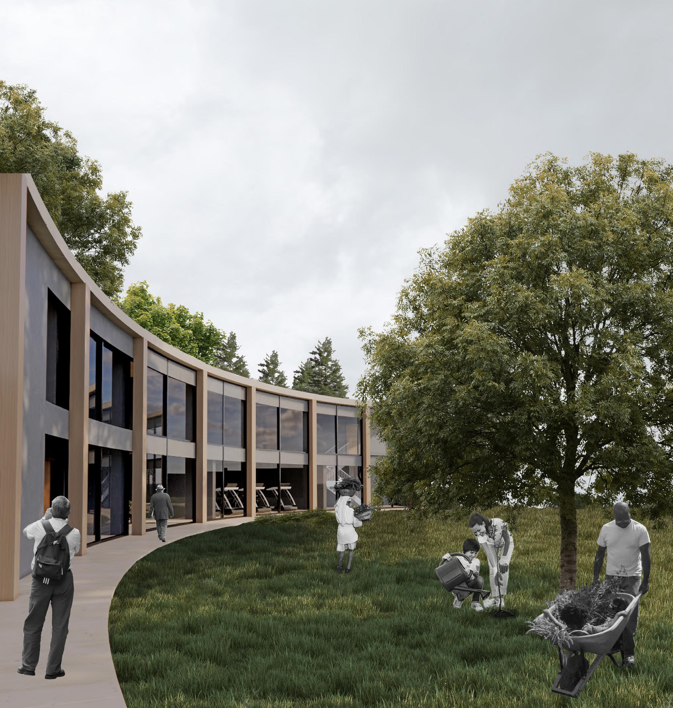 From this exterior perspective, it’s clear how the structure seamlessly integrates with the existing vegetation. The design of this area was driven by the goal of establishing an appealing setting around the tree, providing a space where people of all ages can partake in a range of activities, including relaxation, play, reading, and planting.
