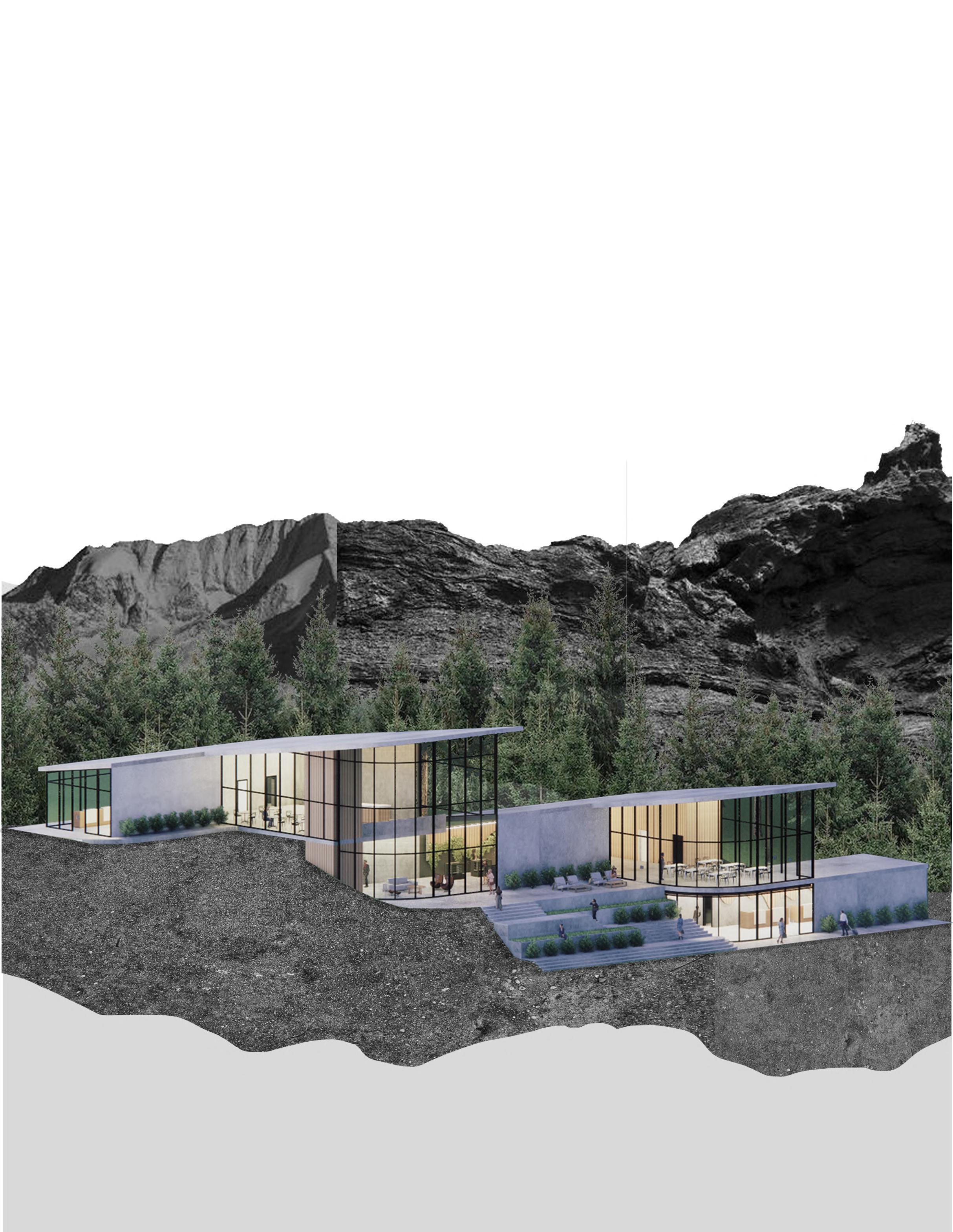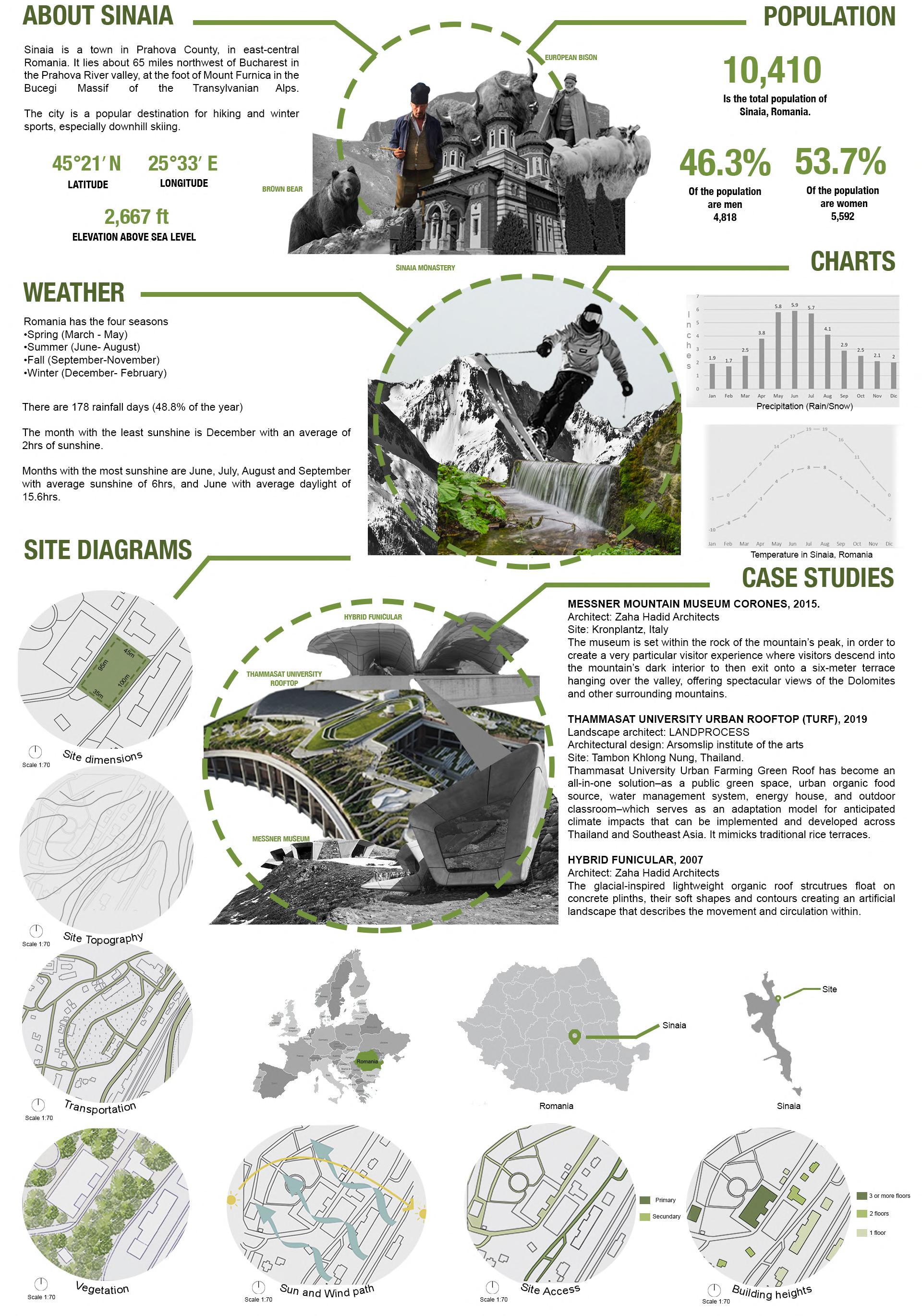 The name Vias comes from the spanish word ways or route. This design was inspired by the directionality of the train tracks of Sinaia, Romania. The abstract concept shows curvature and movement. The transitional train station was designed for the community and visitors of Sinaia with the purpose of transporting individuals from the train station to the hotel or town. The design includes three floors which are the way to each person’s destination.