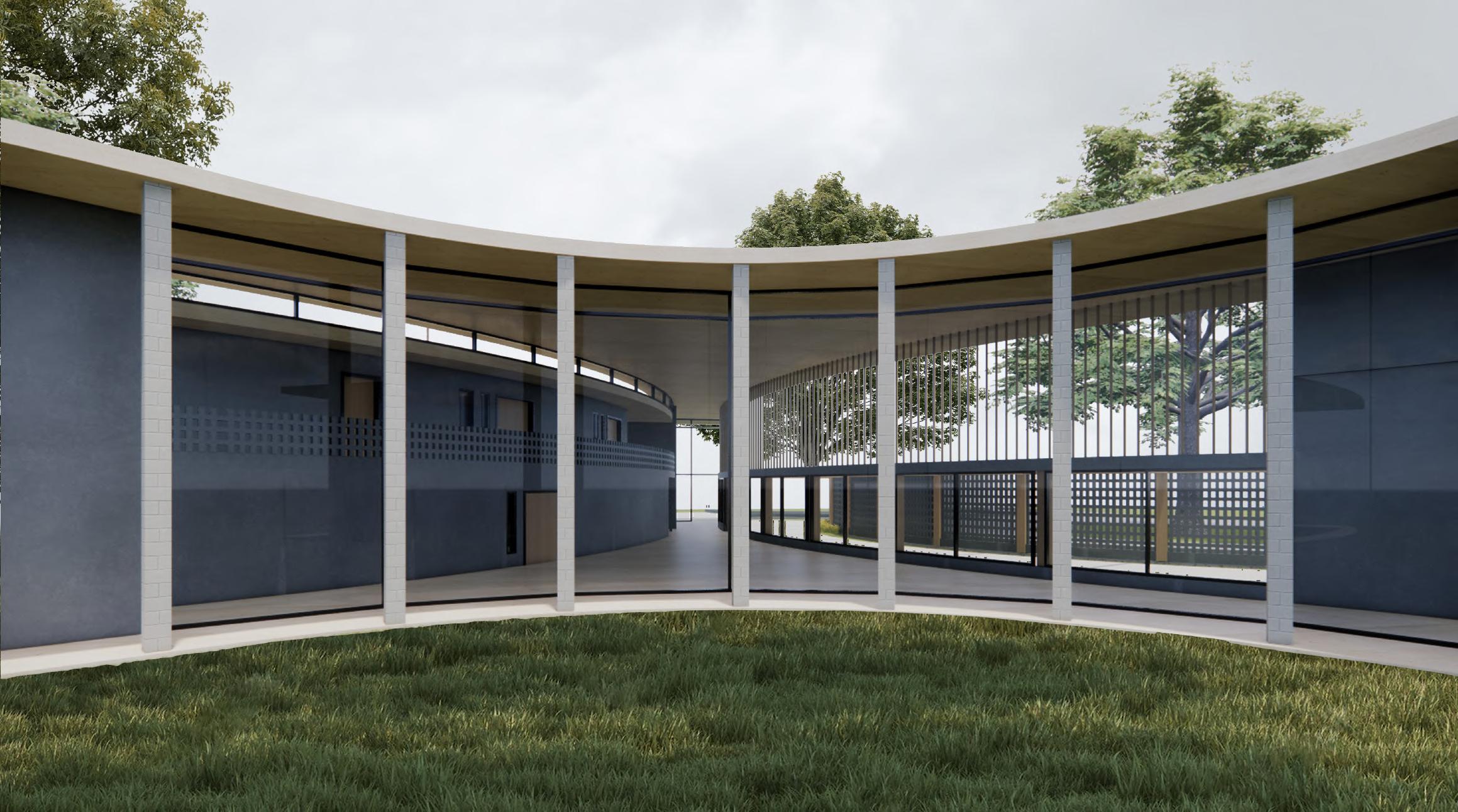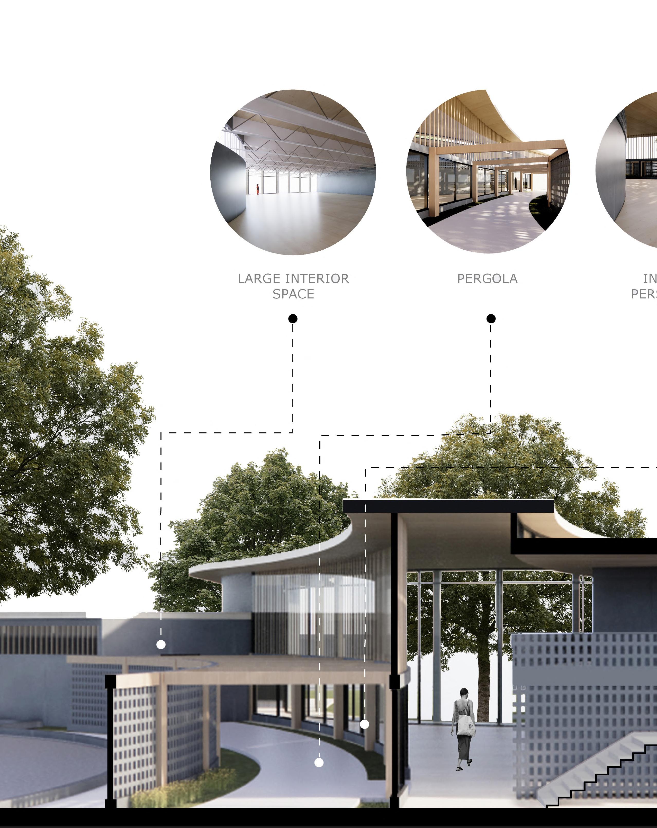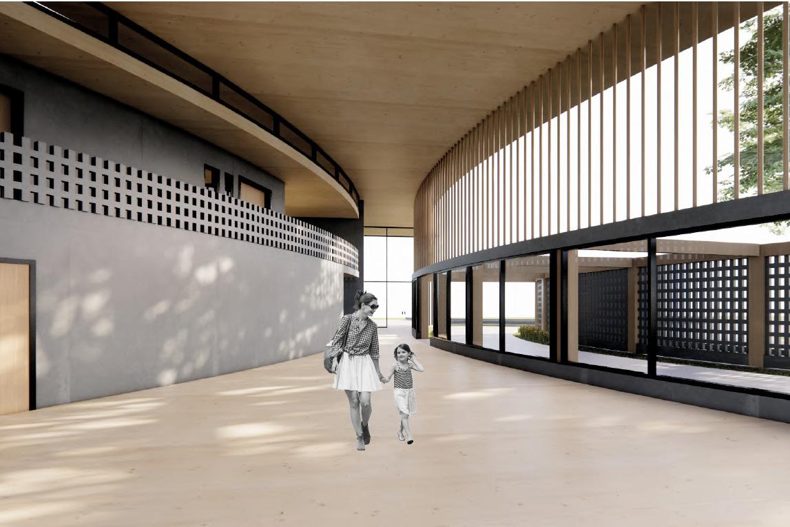 This interior perspective within the community center offers a glimpse of the space’s seamless flow. To the left, one can observe the balcony of the second-floor classrooms and multimedia rooms, while on the right, a pergola pathway that leads to the large interior area.