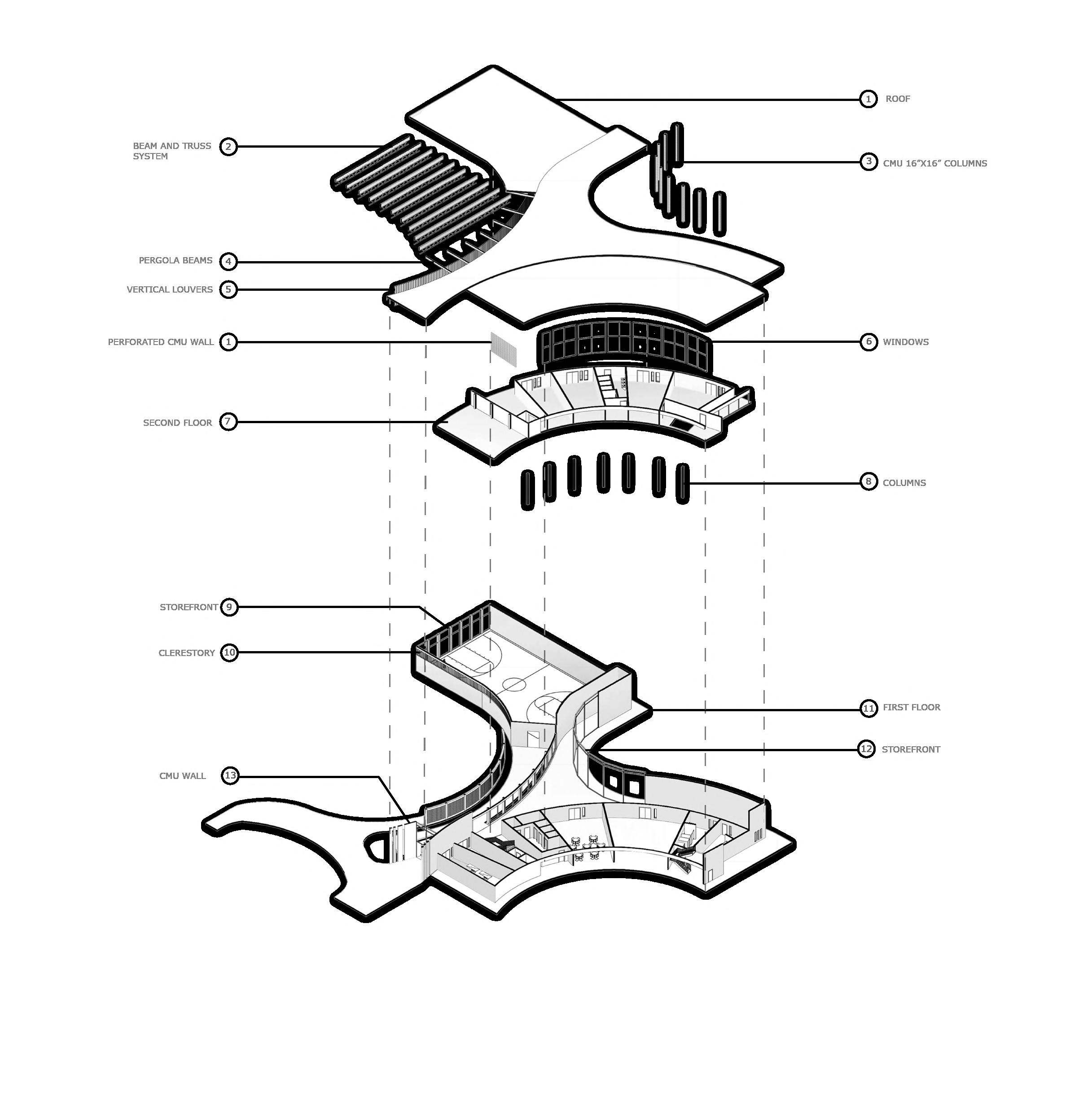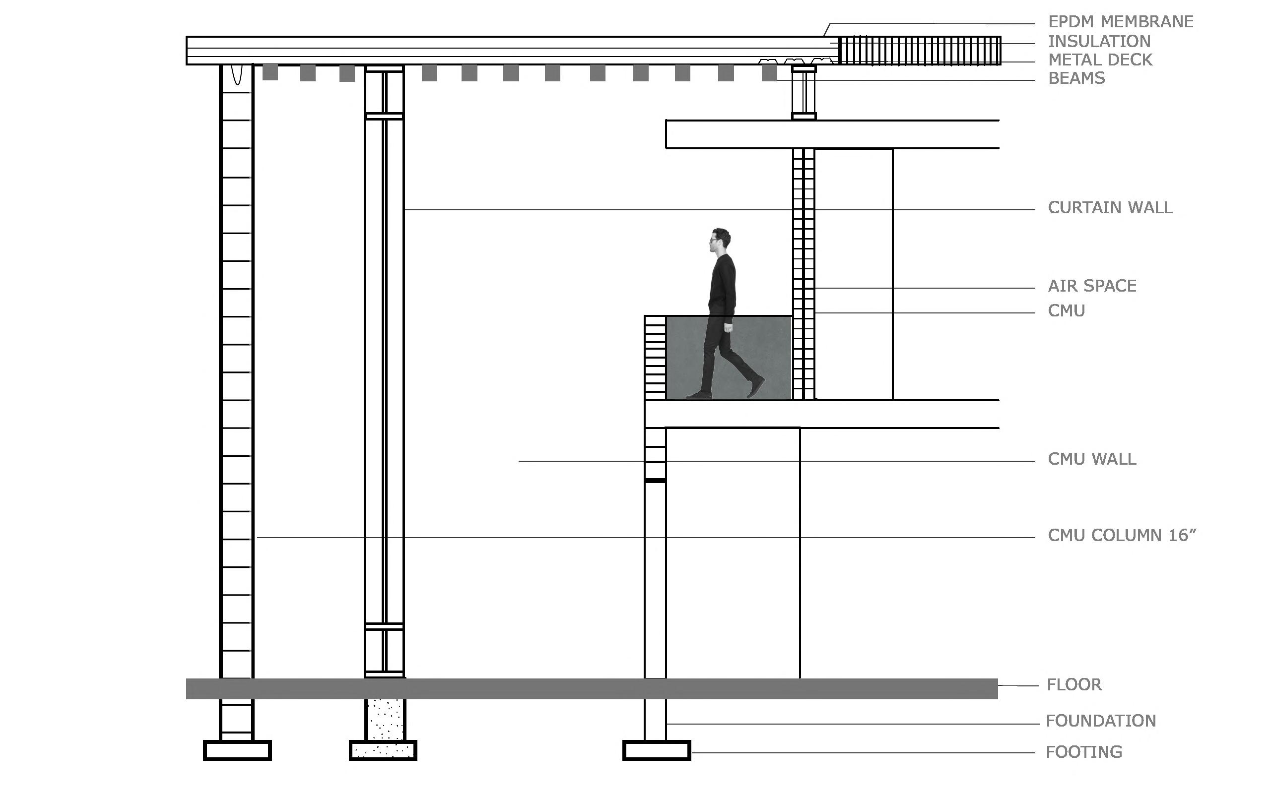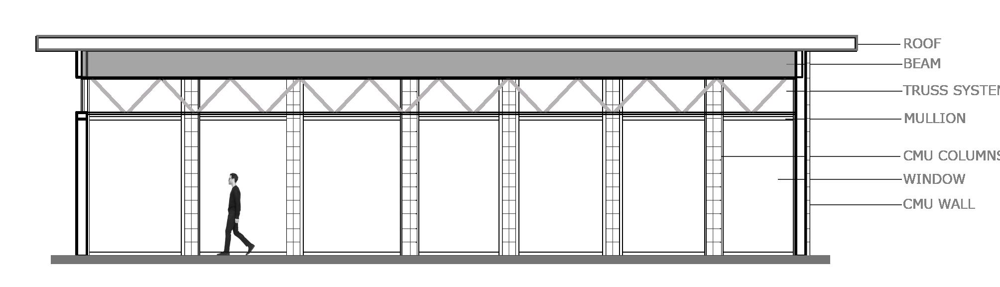 ROOF WINDOWS CMU WALL CLERESTORY STOREFRONT SECOND FLOOR PERFORATED CMU WALL VERTICAL LOUVERS
