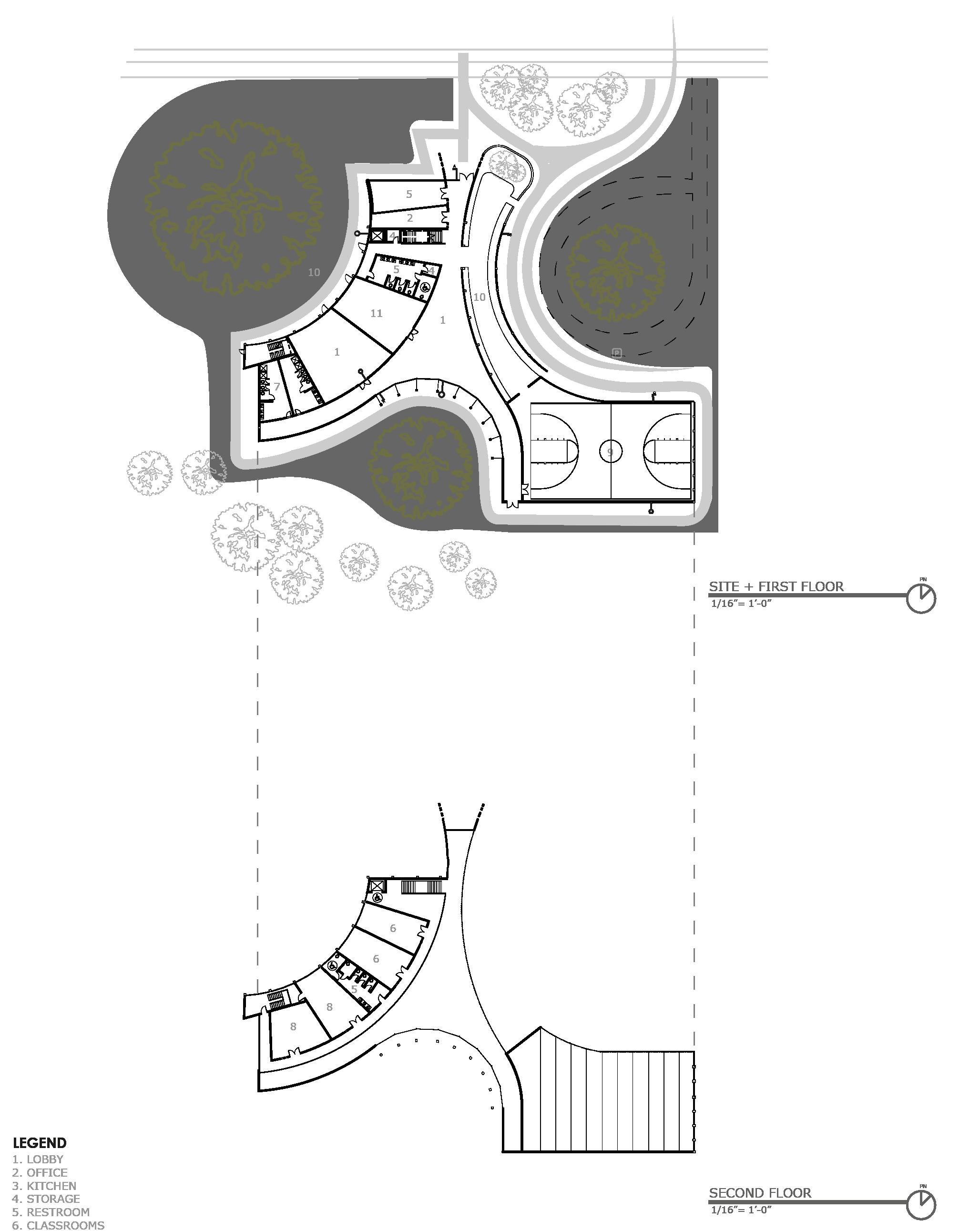 LEGEND 1. Lobby 2. Office 3. Kitchen 4. Storage 5. Restroom 6. Classrooms 7. Changing Rooms 8. Multi-Purpose Rooms 9. Large Interior Space 10. Large Exterior Space 11. Physical Fitness Room B D C A