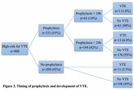 tified in the 251 patients who received prophylaxis. We identified 28 VTE events in 25 patients, for a VTE rate of 5.4% in this high-risk population. Two patients developed pulmonary embolism, and the remainder of the VTE events were DVTs. There was no significant difference in the rate of VTE based solely on receipt of prophylaxis, but patients who received prophylaxis earlier had significantly lower rates of VTE.
