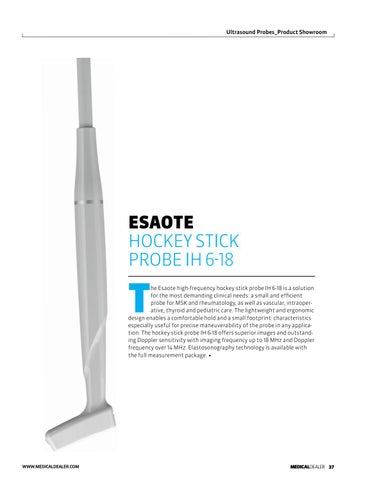 he Esaote high-frequency hockey stick probe IH 6-18 is a solution for the most demanding clinical needs: a small and efficient probe for MSK and rheumatology, as well as vascular, intraoperative, thyroid and pediatric care. The lightweight and ergonomic design enables a comfortable hold and a small footprint: characteristics especially useful for precise maneuverability of the probe in any application. The hockey stick probe IH 6-18 offers superior images and outstanding Doppler sensitivity with imaging frequency up to 18 MHz and Doppler frequency over 14 MHz. Elastosonography technology is available with the full measurement package. •