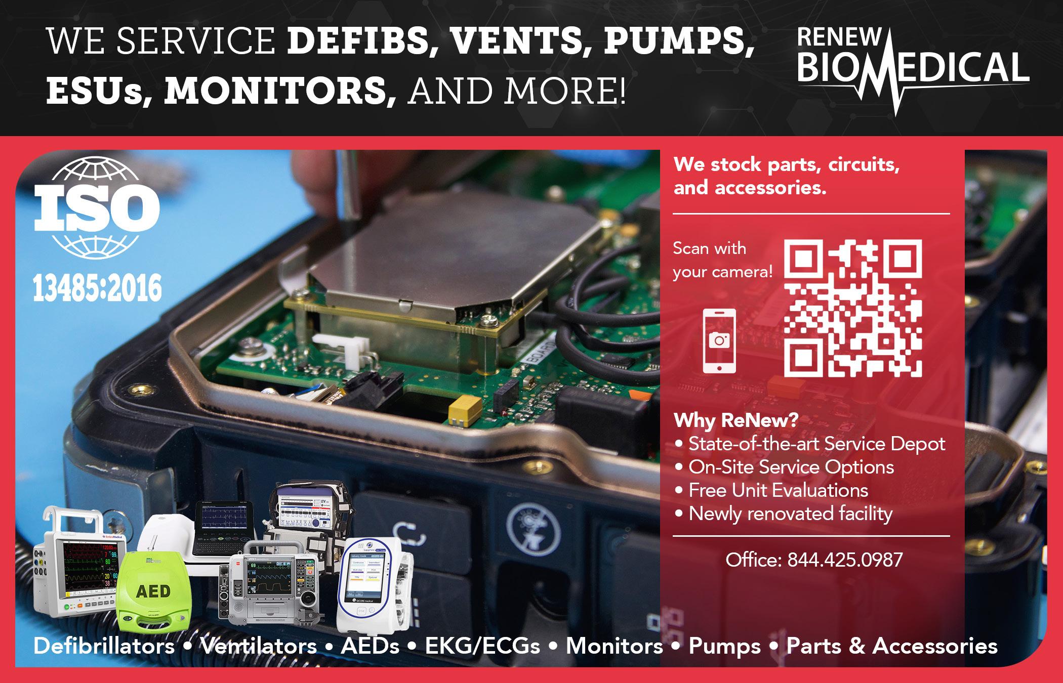 Core repairs include: Infusion Pumps, All Monitors, ESUs, Defibrillators, Light Sources