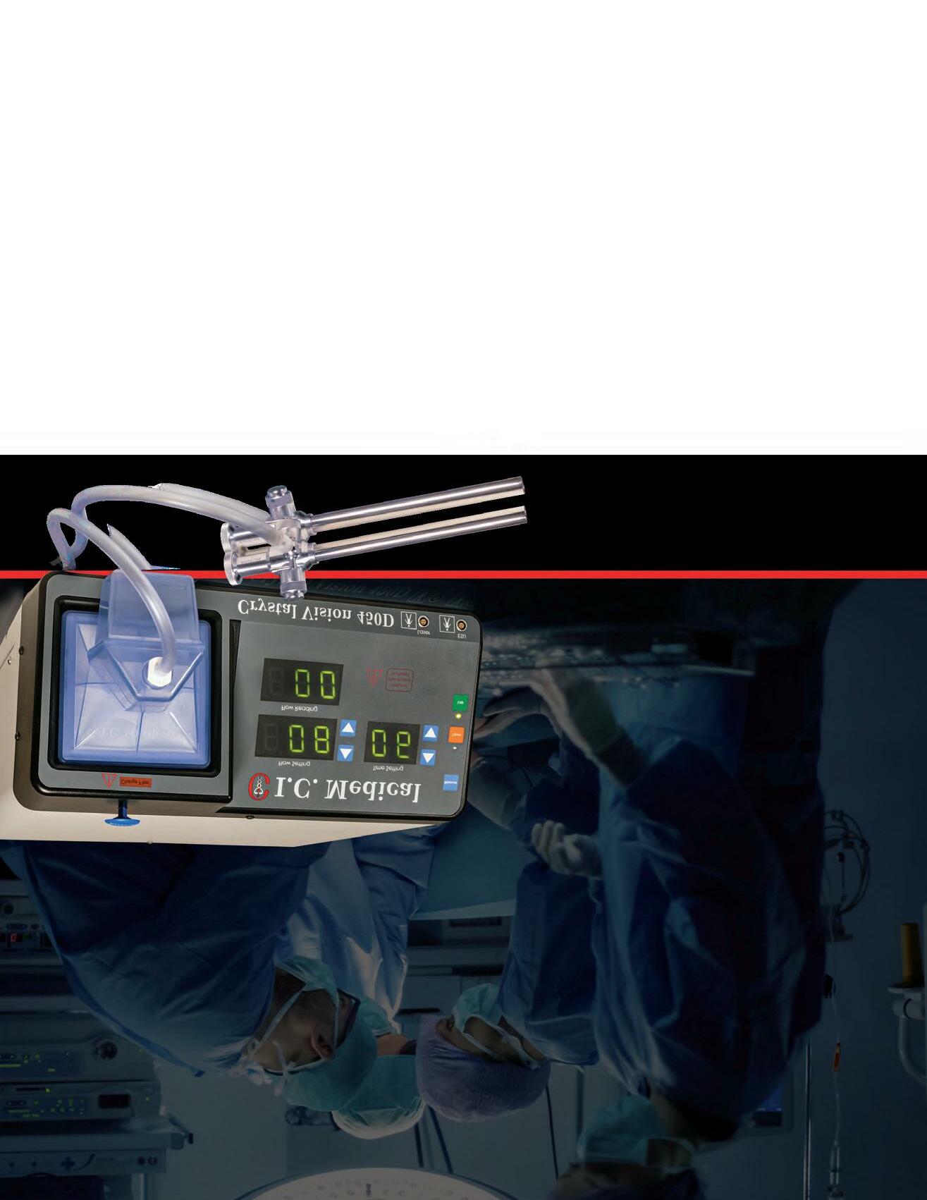 THE MARKET I.C. Medical’s patented Crystal Vision® surgical smoke evacuator is the only surgical smoke evacuation device with both laparoscopic and open procedure modes. • In laparoscopic mode, the Crystal Vision® monitors pneumoperitoneal pressure and activates the pump when a preset pressure is exceeded, helping reduce the potential of an air embolism. • For open procedures, the Crystal Vision® pump has the highest suction power of any plume evacuator. This enables the highest flow at the nozzle leading to more e