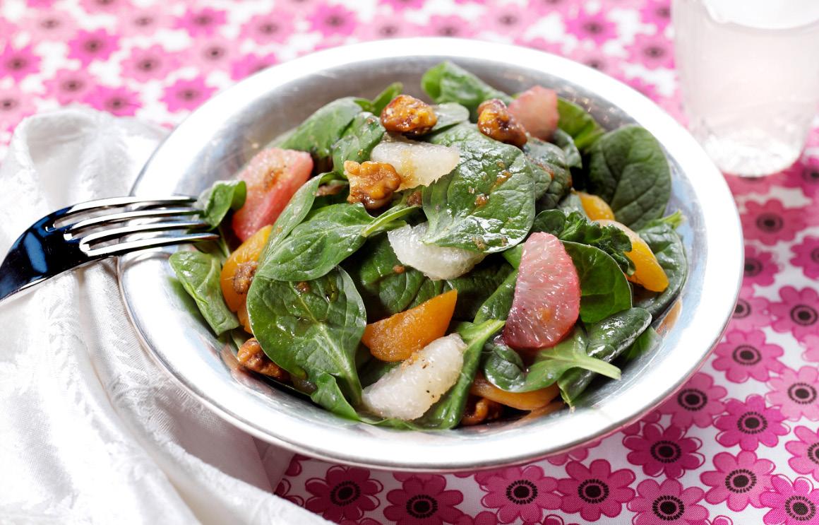 Spinach contains iron as well as age-defying antioxidants. Grapefruit is chock-full of vitamin C and potassium. You can use vitamin-C-packed pink or white grapefruit in this salad, though pink grapefruit has the added benefit of lycopene. If you use whole segments of the grapefruit, you’ll also add fiber. The candied walnuts and dried apricots balance the acidity of the grapefruit and increase the antioxidants in this dish. My Honey-Lime Dressing perfectly complements the mellow flavor of the spinach.