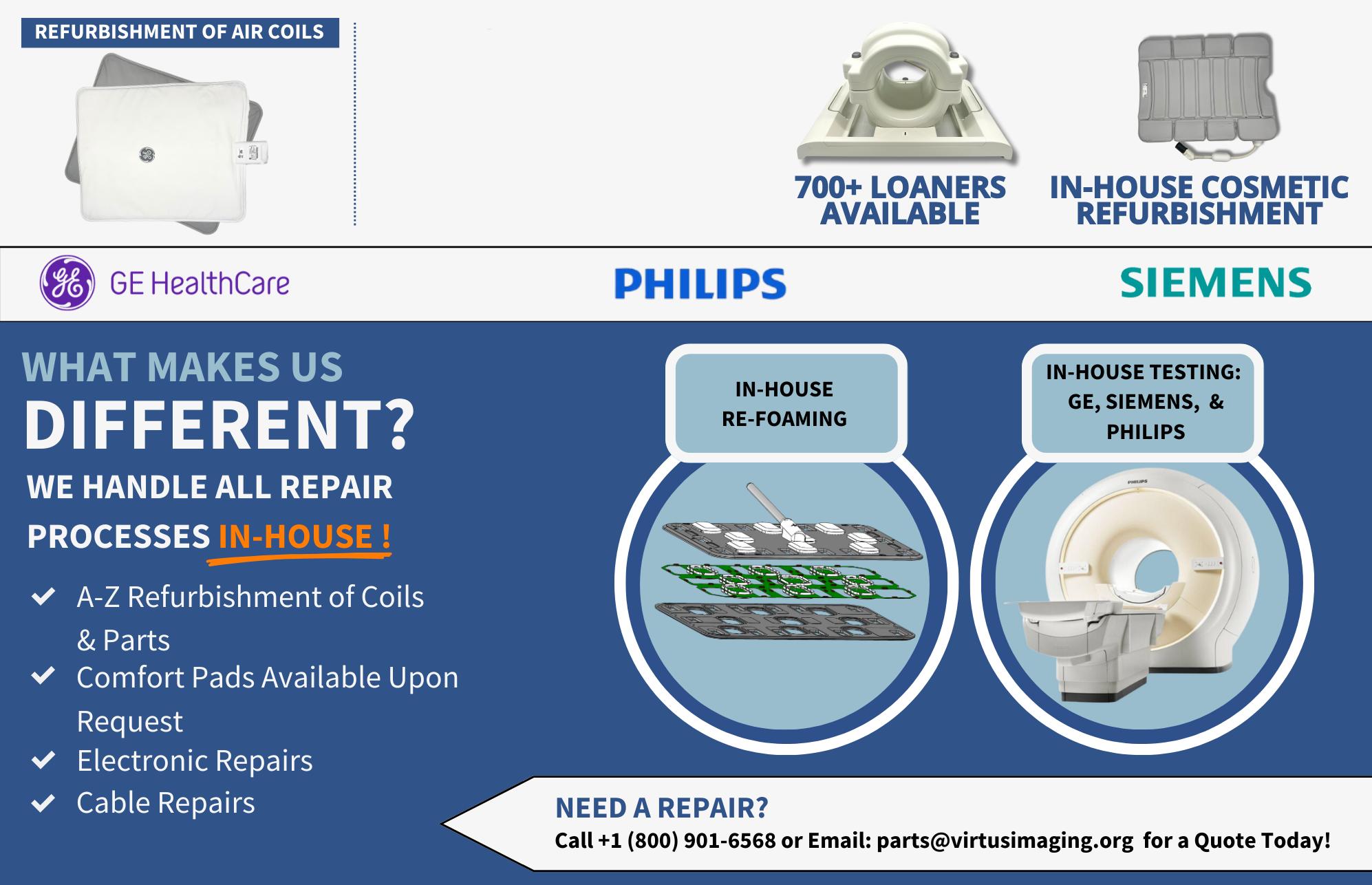 Discover the leading edge of MRI parts and coil repair through Virtus Imaging Partners cutting-edge technology. Specializing in GE, Siemens, and Philips manufactures. State of-the-art facilities dedicated to all repairs, coil refoaming, and cable maintenance. All our parts and coils undergo rigorous in-house system testing to ensure optimal functionality. Explore our impressive inventory of available parts and coils for sale at Virtus Imaging.