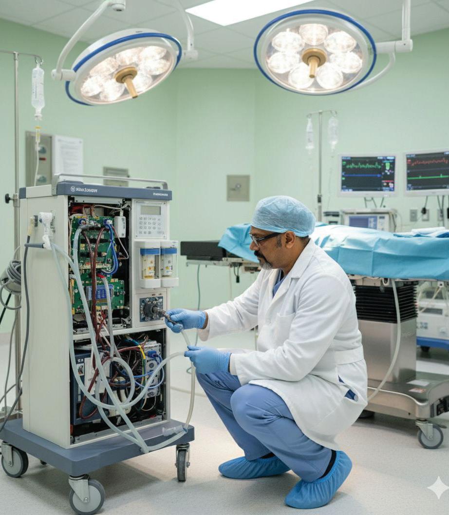 ‘I’ve just finished replacing the ABG machine’s reference electrode and completing its calibration. On my way, I’ll take a quick look at the chemistry analyzer, then head to the ICU to replace the ventilator’s oxygen sensor—after that, I’ll check the MRI helium level.’