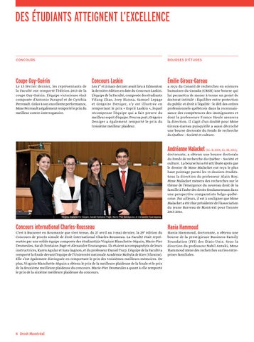 doctorante, a obtenu une bourse doctorale du Fonds de recherche du Québec - Société et culture. La bourse lui a été attribuée après que le dossier de Mme Malacket eut reçu le plus haut pointage parmi les 11 dossiers étudiés. Sous la direction du professeur Alain Roy, Mme Malacket mènera des recherches sur le thème de l’émergence du nouveau droit de la famille à l’aube des droits fondamentaux dans une perspective comparatiste belgo-québécoise. Par ailleurs, il est à souligner que Mme Malacket a été élue présidente de l’Association du jeune Barreau de Montréal pour l’année 2013-2014. Virginie Blanchette-Séguin, Sarah Fontaine-Pagé, Marie-Pier Desmeules et Alexandre Tourangeau