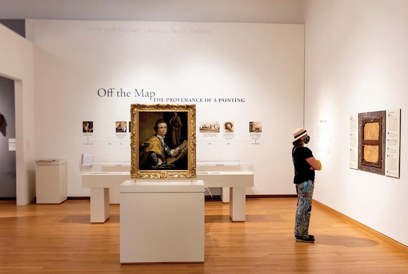 Off the Map: The Provenance of a Painting at the Nasher Museum of Art is a study in provenance research of a single work of art. The exhibit examines the painting Portrait of an Artist, now attributed to Joseph Wright of Derby (1734–1797) and bequeathed to the Nasher in 2013 by Mary D.B.T. Semans, in memory of her mother Mary Duke Biddle. Associate Curator Molly Boarati organized the exhibit, which examines the eighteenthcentury painting’s journey from its creation 250 years ago to its current place in the Nasher’s collection. The installation displays the painting’s archival documents and the fascinating path it has traveled, including its recent conservation and change in attribution from Joseph Siffred Duplessis to Joseph Wright of Derby.