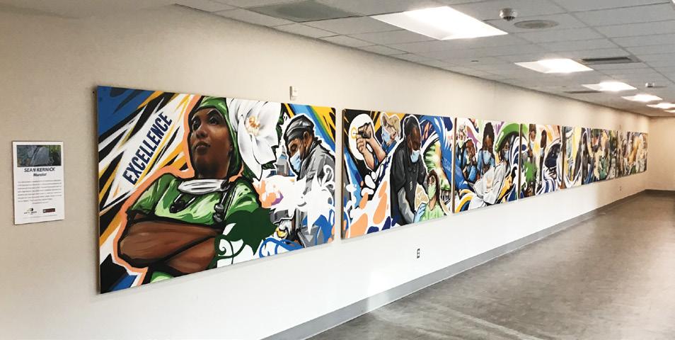 The mural is displayed in the concourse that leads from the main hospital to the Duke Cancer Center and Duke Medicine Pavilion. Now a permanent part of the Duke University Hospital Art Collection, it has touched the hearts of the hospital staffers and become a point of pride for all those on the front lines during the pandemic.