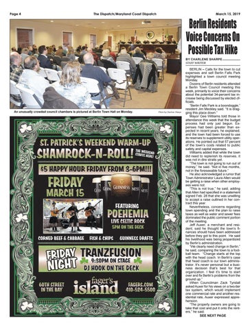 BERLIN – Calls for the town to cut expenses and sell Berlin Falls Park highlighted a town council meeting Monday. Dozens of Berlin residents attended a Berlin Town Council meeting this week, primarily to voice their concerns about the potential 34-percent tax increase being discussed by elected officials. “Berlin Falls Park is a boondoggle,” resident Jim Meckley said. “It is dragging this place down.” Mayor Gee Williams told those in attendance this week that the budget process had only just begun. Expenses had been greater than expected in recent years, he explained, and the town had been forced to use its reserves to supplement utility operations. He pointed out that 57 percent of the town’s costs related to public safety and capital expenses. Williams added that while the town did need to replenish its reserves, it was not in dire straits yet. “The town is not going to run out of money,” he said. “Not in five months, not in the foreseeable future.” He also acknowledged a rumor that Town Administrator Laura Allen would be getting a raise when other employees were not. “This is not true,” he said, adding that Allen had specified in a statement signed Feb. 28 that she was unwilling to accept a raise outlined in her contract this year. Nevertheless, concerns regarding town spending and the plan to raise taxes as well as water and sewer fees dominated the public comment portion of the meeting. Jeff Auxer, a merchant and resident, said he thought the town’s finances should have been addressed before they got to this point. He said his livelihood was being jeopardized by Berlin’s administration. “We clearly need change in Berlin,” he said, comparing the town to a football team. “Change starts at the top with the head coach. In Berlin’s case that head coach is our town administrator. It’s never personal but a business decision that’s best for that organization. I feel it’s time to start over and fix Berlin’s problems from the ground up.” When Councilman Zack Tyndall asked Auxer for his views on a two-tier tax system, which would implement one commercial rate and another residential rate, Auxer expressed apprehension. “The property owners are going to take that cost and put it onto the renters,” he said. SEE NEXT PAGE