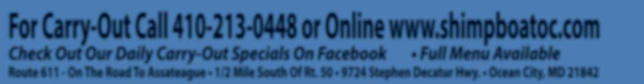 Locally Famous INSIDE SEATING & CARRYOUT OPEN 7 A.M. DAILY Rt. 50-West Ocean City • 410-213-1804 Located Between Comfort Inn Suites & Starbucks Across From Outback Steak House Breakfast Cafe For 45 Years! 15% OFF Any Case Of Wine Not Valid With Other Offers Or Discounts Exp. 4-30-23 • MCD 10% OFF 750 ml/1.5 L Bottle Of Wine Not Valid With Other Offers Or Discounts Exp. 4-30-23 • MCD Mon.-Thurs., 7 a.m.-9 p.m.; Fri.-Sat., 7 a.m.-10 p.m. & Sun., 8 a.m.-8 p.m. Gas • Ice Cigarettes 410-641-2366 • Main St. & Old O.C. Blvd., Berlin, Md. BEER • WINE • SODA Cheers! $100 OFF Any 3-, 4-, 5-Litre Wine Not Valid With Other Offers Or Discounts Exp. 4-30-23 • MCD Open 7 Days A Week St. Pa ul’s Episcopal Chur ch 3 Chur ch St r eet Berlin MD 410~641~4066 JOIN US EASTER SUN DAY 8:30 a.m. (no music) 10:30 a.m. (with music) 10:30 Livestream On Facebook www.stpau lsberlin.org Easter Week Ser vices ar e: 4/7 Good Friday 7pm 4/8 Easter Vigil 7pm 4/9 Easter Day 8:30 & 10:30