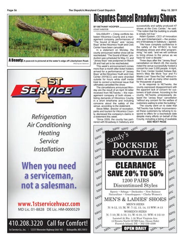 successfully and safely produced 47 shows at the Civic Center,” he said. “The notion that the building is unsafe is simply not true.” Adam Epstein, CEO of Innovation Arts and Entertainment – the producers of Broadway in Salisbury – agreed. “We have complete confidence in the safety of the WY&CC to host Broadway shows and other programming,” he said, “and we will continue to bring shows to the venue as we have for over a decade.” Three days after the “Jersey Boys” cancellation on March 28, the county noted the venue successfully hosted a concert for over 3,000 people. In April, the Civic Center hosted Kelsea Ballerini’s Miss Me More Tour and PJ Masks Live! “Save the Day” without incident, as well as many other events for thousands of guests. In its response to NETworks, the county expressed disappointment with the apparent lack of concern for customers of both shows. According to the county, NETworks unnecessarily delayed the “Jersey Boys” cancellation “without any concern for the welfare of customers waiting to enter the building.” The county went on to state that “NETworks has further inconvenienced these customers by refusing to respond to offers for a reschedule date despite many efforts on behalf of the County, including a listing of available SEE NEXT PAGE