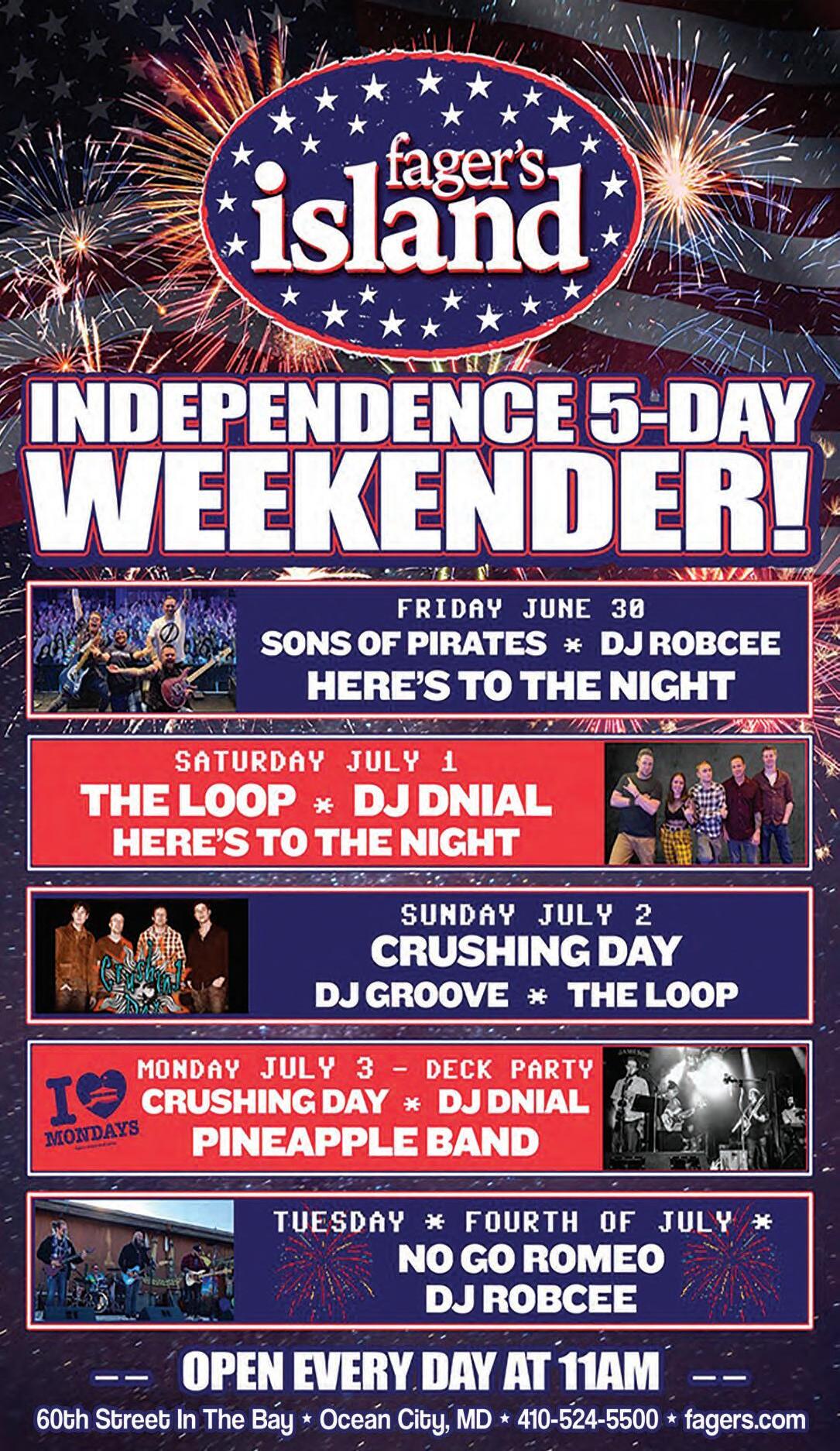 Ocean City Marketing and Communications Director Jessica Waters said the town’s celebrations will include a downtown show featuring the U.S. Army Band Downrange and DJ Kutt. At Northside Park, DJ Knappy and Gizmo will provide a family friendly show.