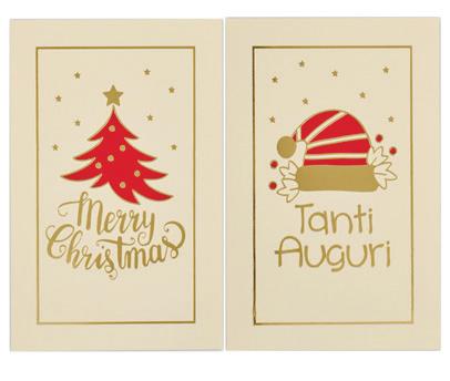 Biglietti doppi formato 11,7x17cm. Stampa offset su cartoncino liscio bianco. Blisterati 1 busta/1 biglietto. Fantasie assortite. Umv: 12pz