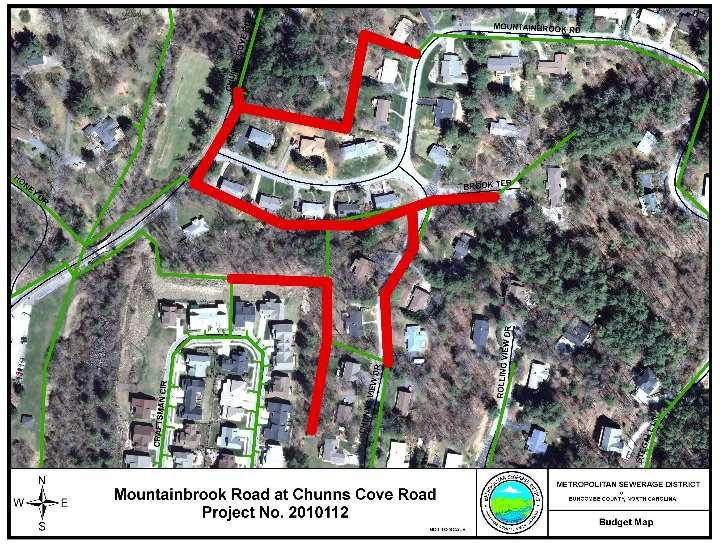 Another rehabilitation project completed this past year was the “Mountainbrook Road @ ChunnsCoveRoad”sewerrehabilitationinEastAsheville.Thisprojectrelocatedexistingsewer lines from the rear of the parcels (where access and maintenance was extremelydifficult)to thepublic street rights of way. This project also eliminated one high aerial creek crossing where existing support piers were failing due to erosion. The subjectlineshadahistory ofSSOs and the project replaced approximately 3,204LF of sewer lines.