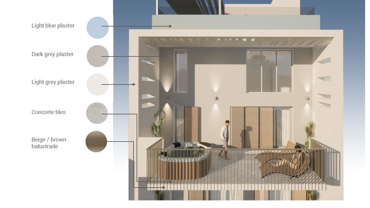 Exterior Finish Light & dark grey plaster • Blue accents • Beige railings