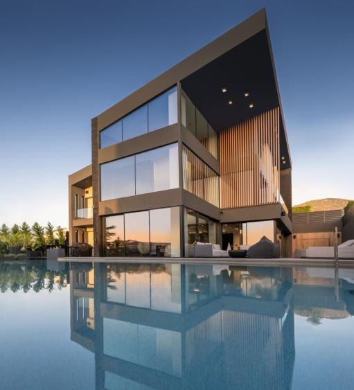 Crafted with the renowned construction quality, the residence integrates walnut wood, stone, marble, and glass, resulting in a bold yet timeless architectural statement surrounded by landscaped gardens and a private pool area.