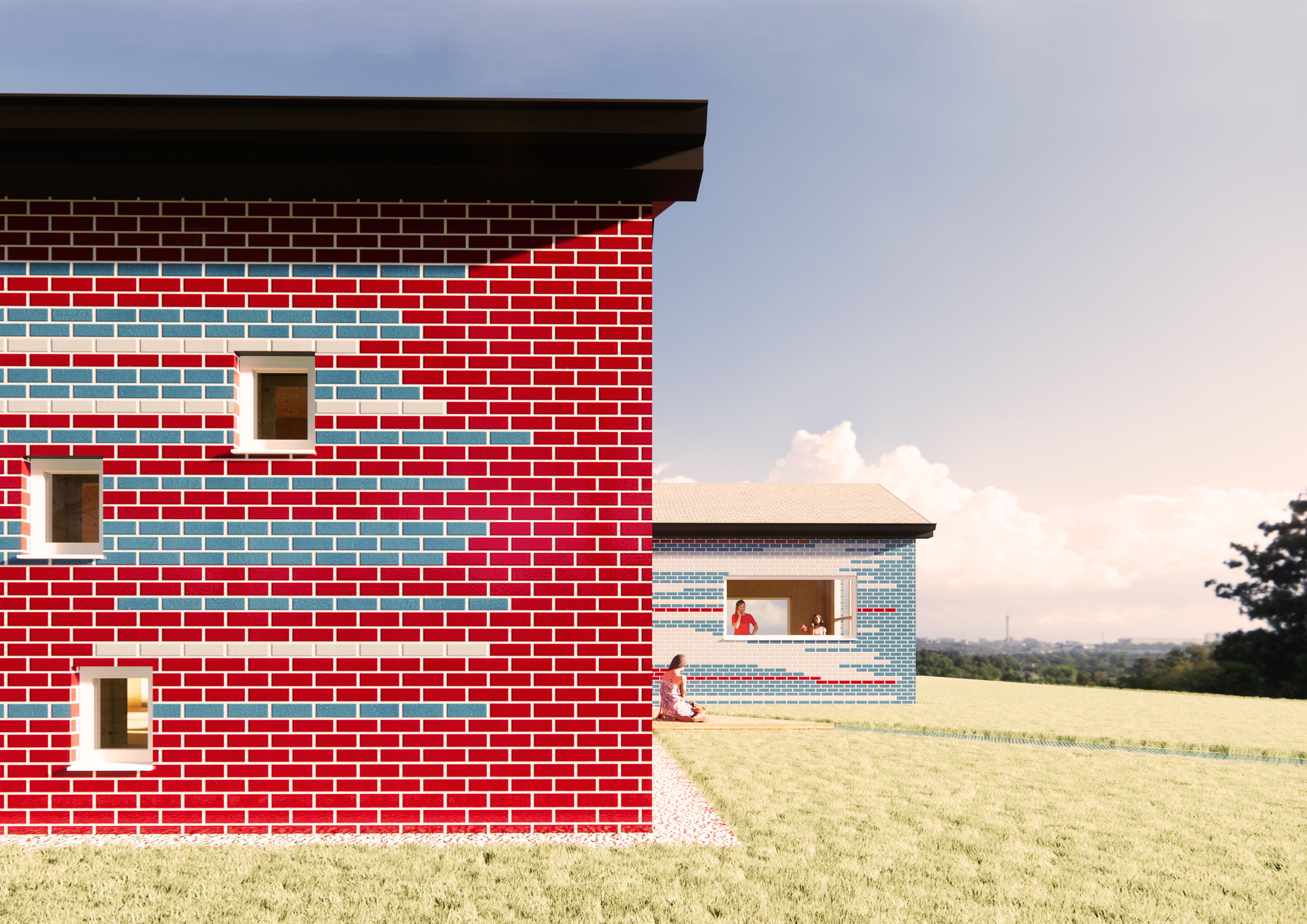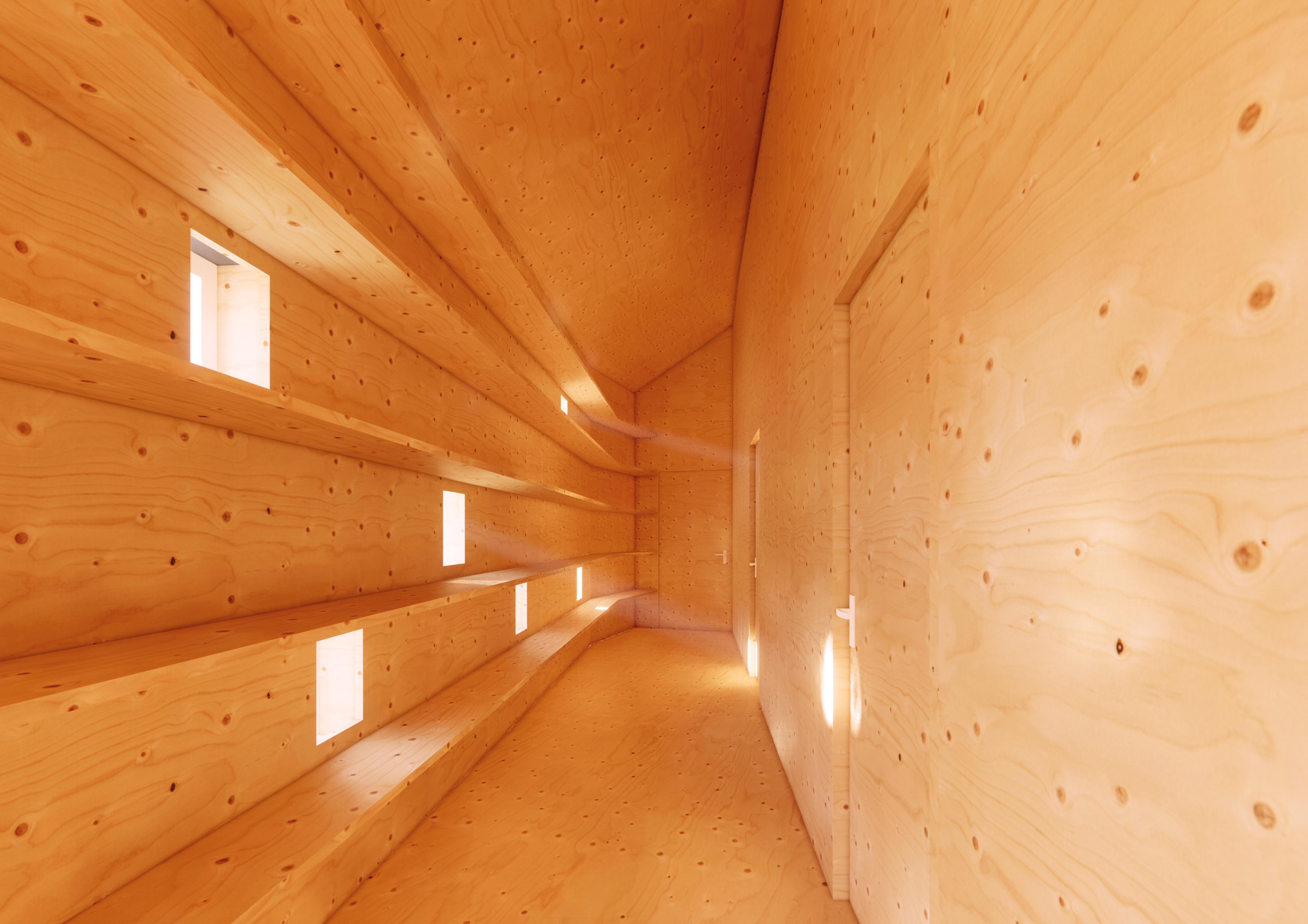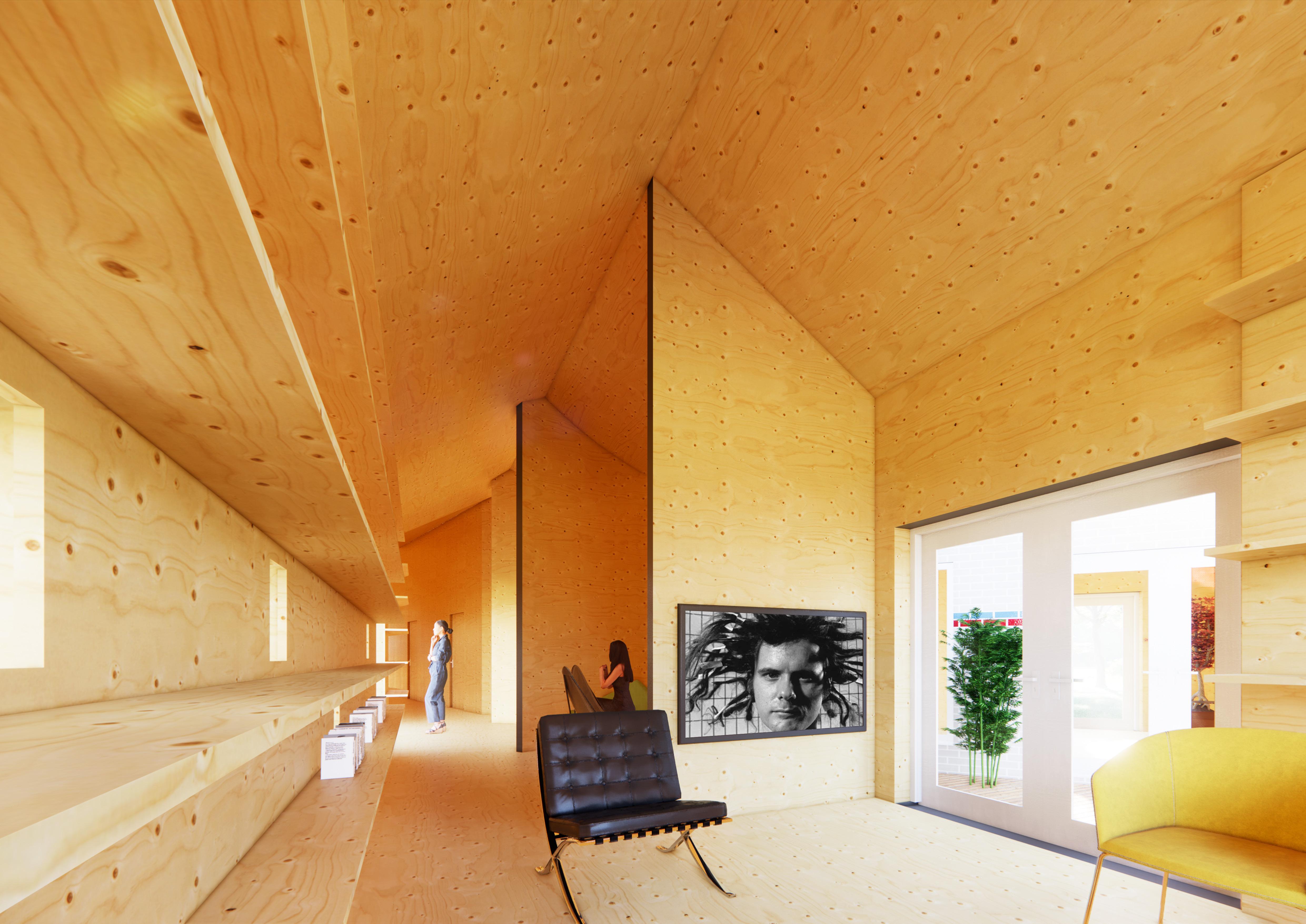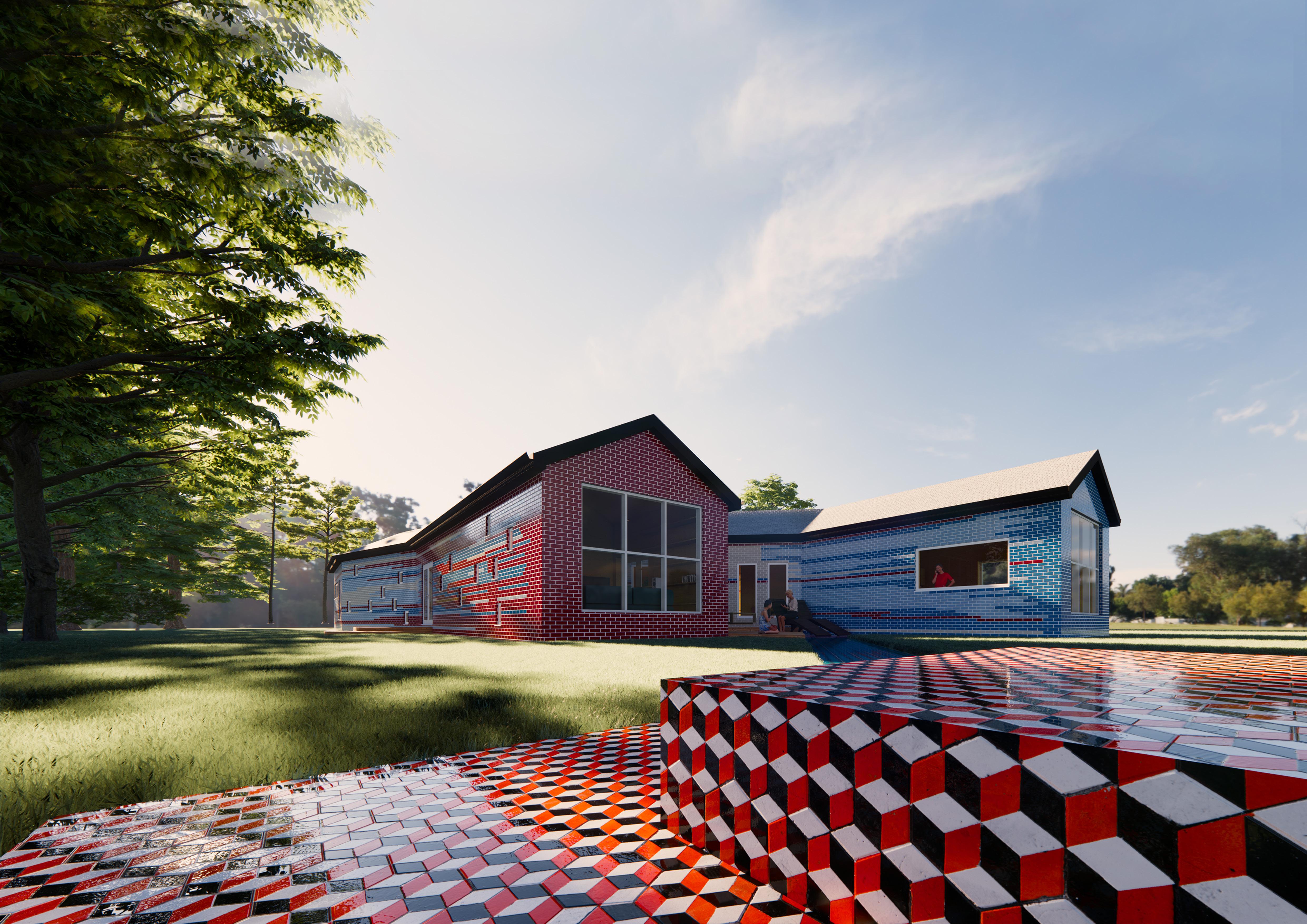 Branch House is a conceptual project inspired by this site. The design emphasizes movement, reflected in both the branch-like form and the dynamic glazed brick cladding, contrasted with the static plywood interiors and sweeping walls and ceilings. Informal meeting areas, distinguished by different ceramic designs, are strategically placed around the building.