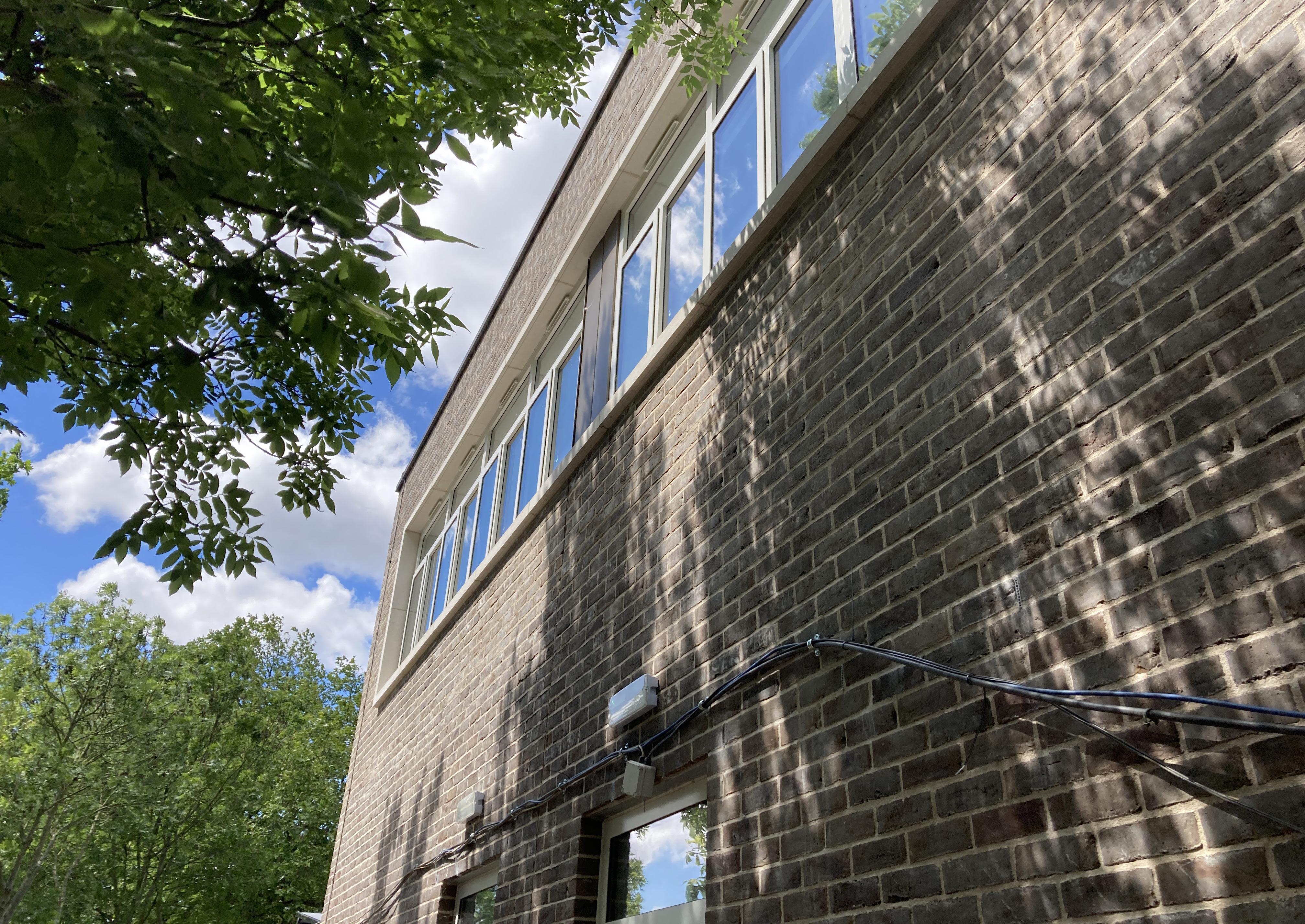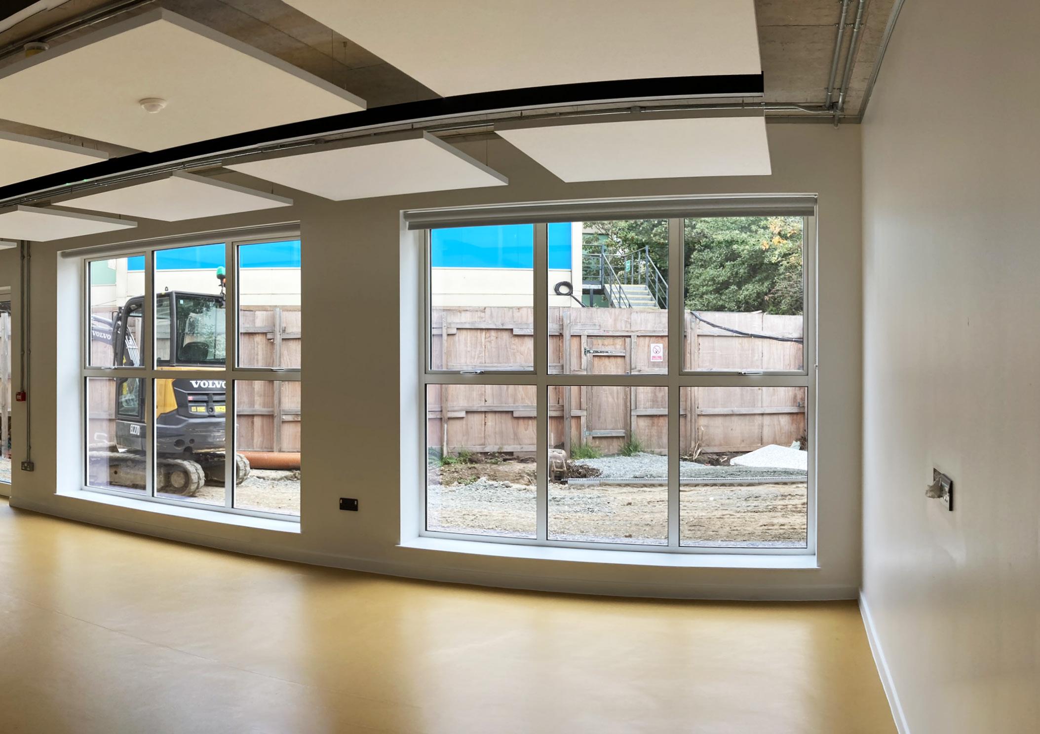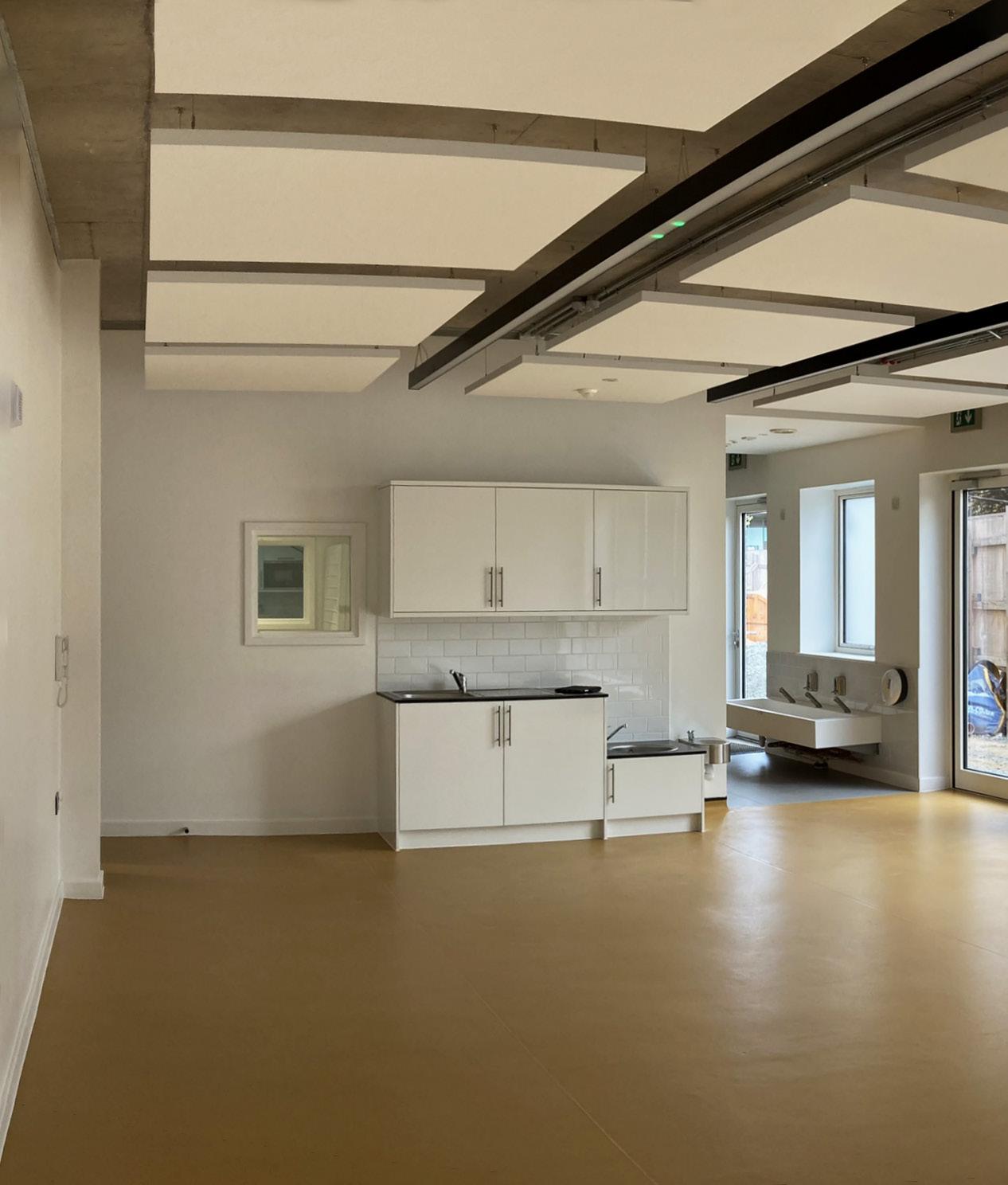 During construction of the extensions, it was discovered that the existing structure did not have a concrete soffit as initially assumed, but instead consisted of a concrete beam and block system. These beams had been notched by existing services, compromising their load-bearing capacity. After structural analysis, it was determined that the roof could no longer support any additional weight. Consequently, a completely new strategy for fixing services had to be devised.
